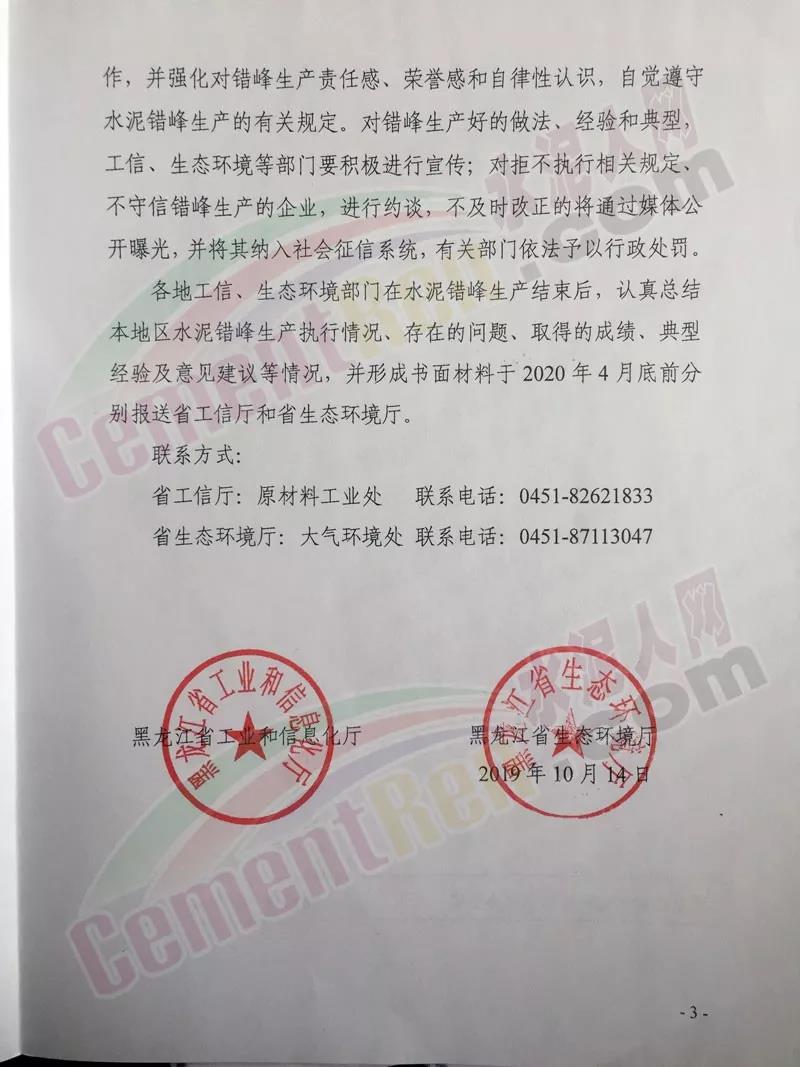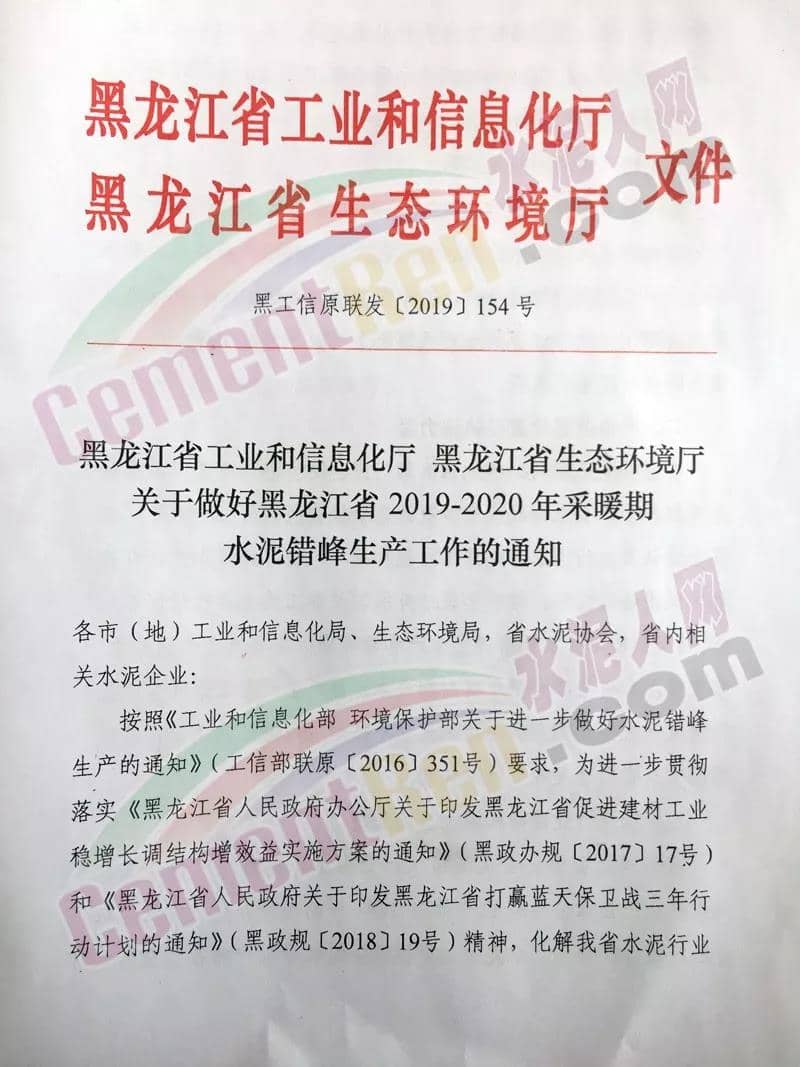 日前,黑龍江工信廳聯(lián)合生態(tài)環(huán)境廳聯(lián)合發(fā)布《關(guān)于做好黑龍江省2019-2020年采暖期水泥錯峰生產(chǎn)工作的通知》稱:按照工信部、環(huán)境部關(guān)于進一步做好水泥錯峰生產(chǎn)的通知要求,為進一步貫徹落實相關(guān)政府文件要求化解黑龍江省水泥行業(yè)產(chǎn)能過剩矛盾,合理縮短水泥熟料裝置運轉(zhuǎn)時間,減輕采暖期大氣污染,決定黑龍江省2019-2020年采暖期繼續(xù)開展水泥錯峰生產(chǎn)工業(yè)。錯峰生產(chǎn)時間及范圍:2019年10月20日至2020年4月20日在黑龍江全省所有水泥熟料生產(chǎn)企業(yè)(含利用電石渣生產(chǎn)熟料的企業(yè))全面實行錯峰生產(chǎn),其中承擔協(xié)同處置城市生活垃圾及有害廢棄物等任務(wù)的生產(chǎn)線上可以不進行錯峰生產(chǎn),應適當降低水泥生產(chǎn)負荷。通知原文如下: