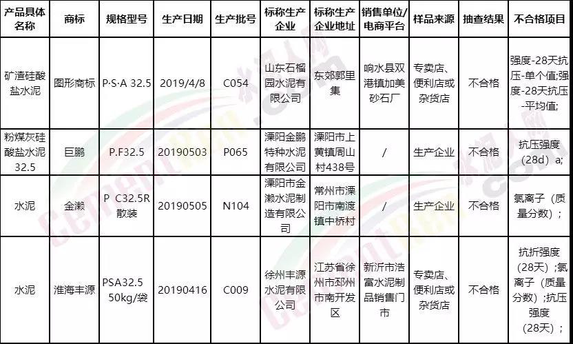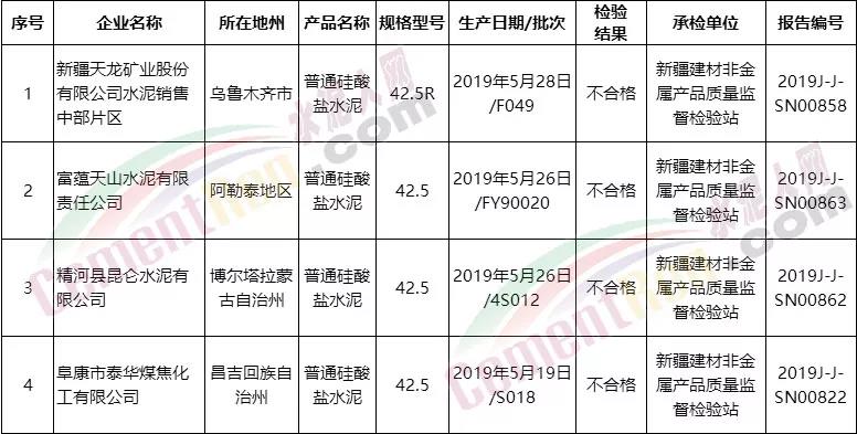 2019年自治區(qū)水泥產(chǎn)品質(zhì)量監(jiān)督抽查未抽樣企業(yè)名單不僅新疆地區(qū),近一年,已經(jīng)多個區(qū)域市場監(jiān)督管理局通報抽檢不合格品名單詳情如下: