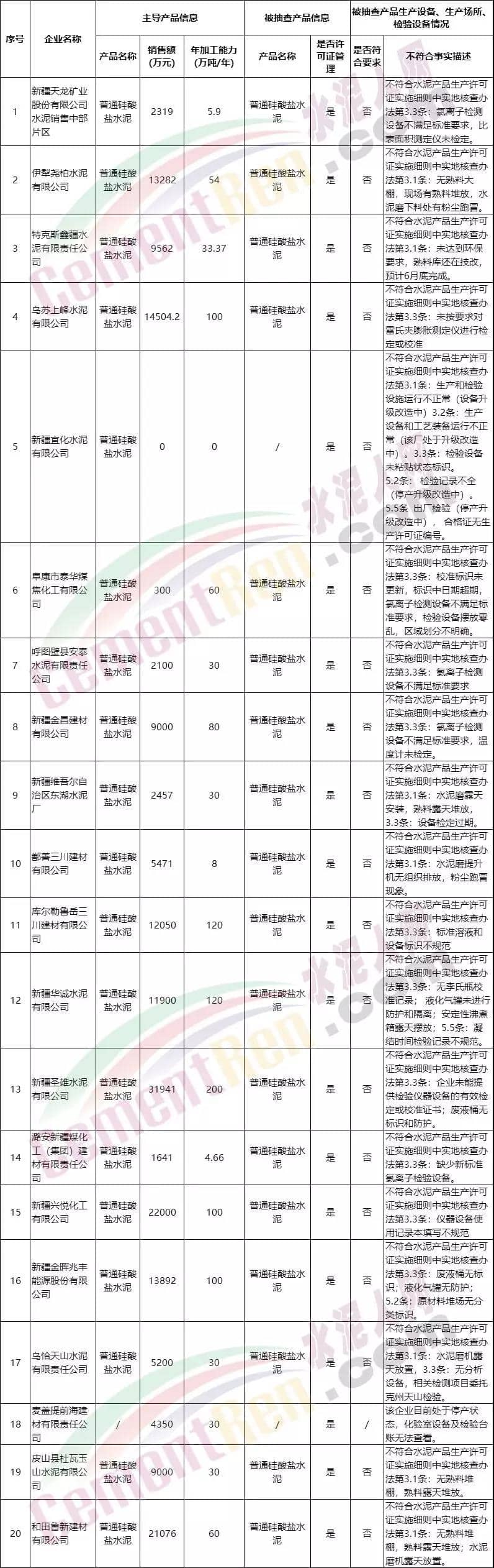 同期對各企業(yè)生產(chǎn)條件進行了監(jiān)督檢查。各地市場監(jiān)督管理部門與新疆維吾爾自治區(qū)產(chǎn)品質(zhì)量監(jiān)督檢驗研究院共同對涉及工業(yè)產(chǎn)品生產(chǎn)許可證的水泥等生產(chǎn)企業(yè)開展生產(chǎn)條件現(xiàn)場監(jiān)督檢查。檢查結(jié)果顯示,大部分企業(yè)證照及資質(zhì)齊全,生產(chǎn)條件規(guī)范,建立了質(zhì)量安全相關(guān)制度。但仍有部分企業(yè)履行質(zhì)量安全主體責(zé)任淡薄,質(zhì)量管理體系有待健全和完善。問題主要體現(xiàn)在以下幾個方面:一是部分檢驗設(shè)備沒有檢定和校準(zhǔn),或超出檢定校準(zhǔn)周期,現(xiàn)場無法提供有效的檢定或校準(zhǔn)證書,部分設(shè)備沒有進行有效的維護保養(yǎng),檢驗準(zhǔn)確性存在安全隱患;二是部分企業(yè)過程控制不嚴(yán)、出廠檢驗記錄不全,原輔料驗收記錄、出廠檢驗記錄等不完整,原輔料存放條件不規(guī)范,產(chǎn)品質(zhì)量安全存在風(fēng)險;三是部分企業(yè)風(fēng)險分析制度不完備,缺少產(chǎn)品追溯和召回管理記錄,內(nèi)部管理有待加強。2019年新疆自治區(qū)水泥生產(chǎn)企業(yè)生產(chǎn)條件檢查結(jié)果不符合匯總表