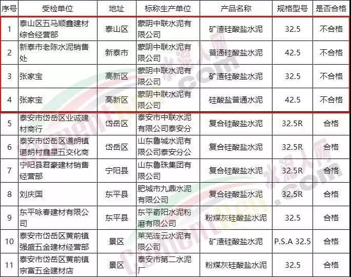 山東泰安4批次樣品不合格,抽樣合格率為63.6%據(jù)通報,泰安市市場監(jiān)管局于2019年8月至10月在全市范圍內(nèi)組織開展了第一批流通領(lǐng)域水泥商品質(zhì)量監(jiān)督抽查。本次共監(jiān)督抽查10家經(jīng)營部,抽取11批次樣品。其中檢出4批次樣品不合格,本次水泥商品抽樣合格率為63.6%。4個批次不合格水泥基本情況:2批次礦渣硅酸鹽水泥和2批次普通硅酸鹽水泥;標(biāo)稱生產(chǎn)單位均為蒙陰中聯(lián)水泥有限公司;標(biāo)識生產(chǎn)單位地址均為山東省蒙陰縣蒙陰鎮(zhèn)東城村;包裝袋上標(biāo)注商標(biāo)均為蒙陰中聯(lián);不合格樣品的不合格項目主要有氯離子、燒失量、3天強度、28天強度等。經(jīng)營者分別是泰山區(qū)五馬順鑫建材綜合經(jīng)營部,新泰市老陳水泥銷售處,北集坡鎮(zhèn)張家寶。泰安市2019年度流通領(lǐng)域水泥商品質(zhì)量第一批專項監(jiān)督抽查結(jié)果總匯表