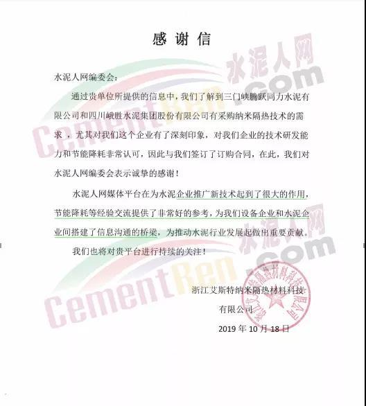 近日,水泥人網(wǎng)收到來自浙江艾斯特納米隔熱材料科技有限公司的一封《感謝信》,為艾斯特納米隔熱材料科技設(shè)備企業(yè)和水泥企業(yè)間搭建了信息溝通的橋梁。