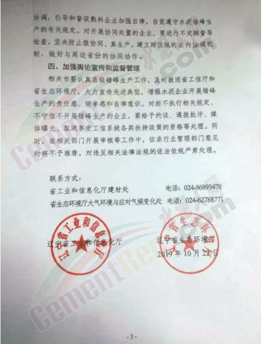 水泥人網(wǎng)消息:日前,遼寧省工業(yè)和信息化廳、生態(tài)環(huán)境廳聯(lián)合下發(fā)關于《遼寧省2019年-2020年采暖期水泥錯峰生產(chǎn)安排的通知(遼工信建材【2019】141號)》文件要求,2019年11月1日至2020年3月31日,省內(nèi)所有水泥熟料生產(chǎn)線實施錯峰生產(chǎn)。其中大連地區(qū)停窯錯峰時間自11月5日至2020年4月5日。