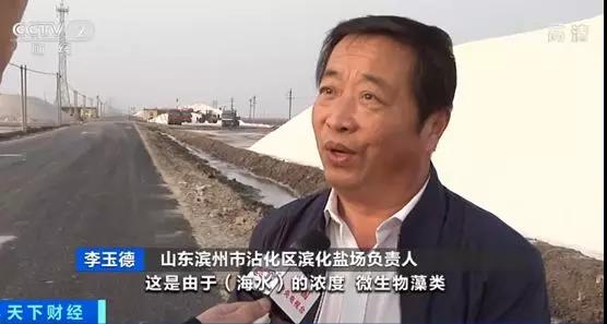 山東省濱州市沾化區(qū)濱化鹽場負(fù)責(zé)人 李玉德:由于海水的濃度、微生物藻類、光線強弱、水的深度,比如有的是20公分,有的是50公分,深度不一樣,所以從上面看起來,顏色也會有一定變化。