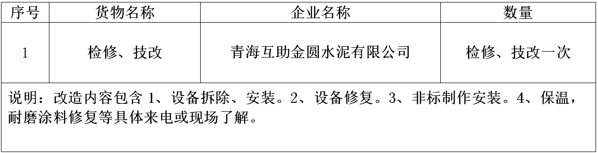 1、招標(biāo)項(xiàng)目:青海互助金圓水泥有限公司檢修、技改項(xiàng)目招標(biāo)。
