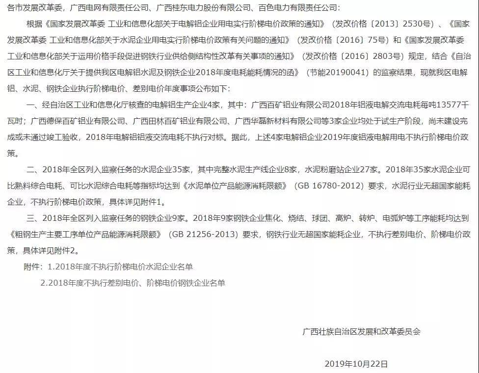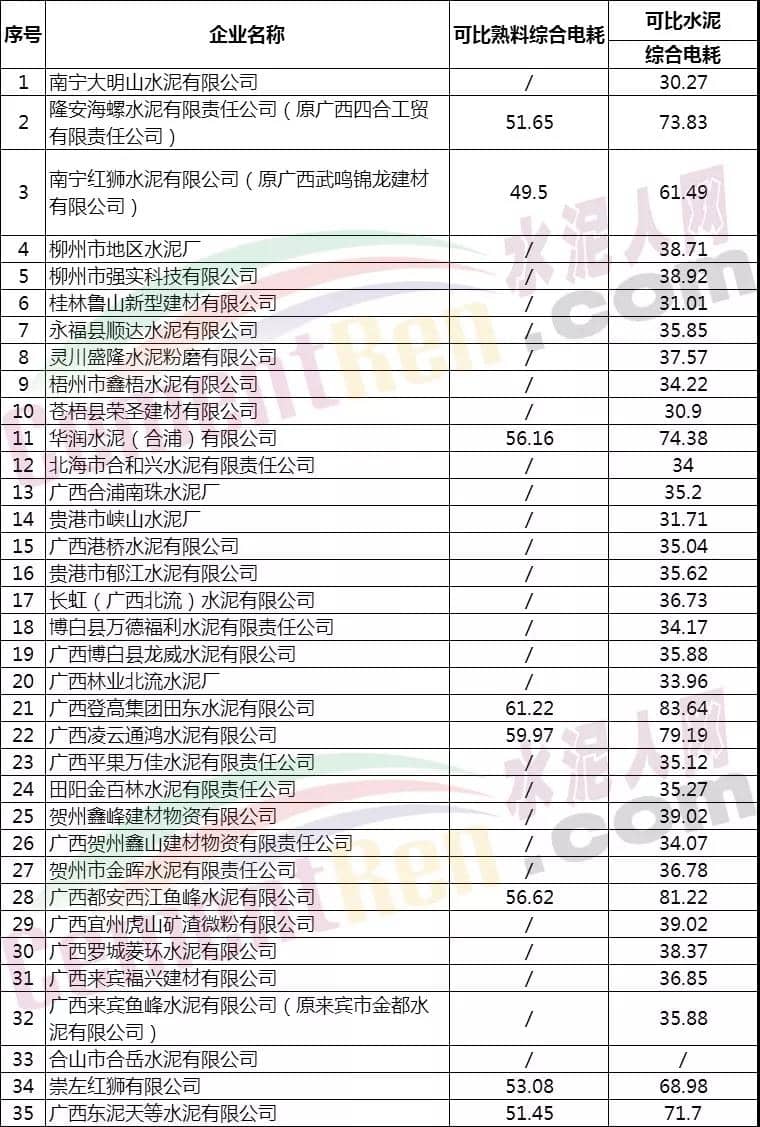 水泥人網(wǎng)消息:日前,廣西壯族自治區(qū)發(fā)改委發(fā)布《廣西壯族自治區(qū)發(fā)展和改革委員會關(guān)于我區(qū)電解鋁水泥鋼鐵企業(yè)執(zhí)行階梯電價差別電價有關(guān)事項的通知》稱: 2018年全區(qū)列入監(jiān)察任務(wù)的水泥企業(yè)35家,其中完整水泥生產(chǎn)線企業(yè)8家,水泥粉磨站企業(yè)27家。2018年35家水泥企業(yè)可比熟料綜合電耗、可比水泥綜合電耗等指標均達到《水泥單位產(chǎn)品能源消耗限額》(GB 16780-2012)要求,水泥行業(yè)無超國家能耗企業(yè),不執(zhí)行階梯電價政策。