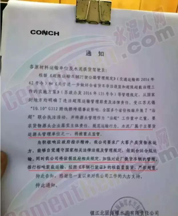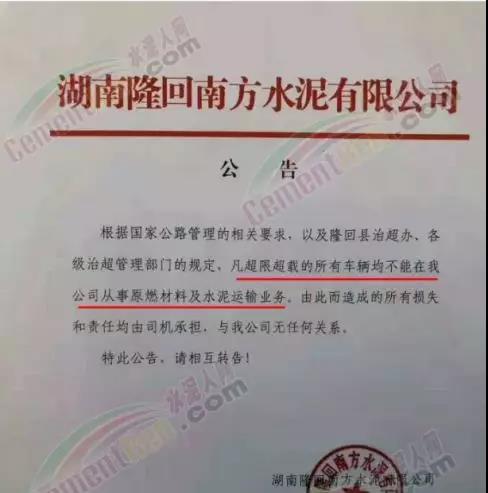 湖南隆回南方水泥有限公司也發(fā)布公告,根據(jù)國(guó)家公路管理的相關(guān)要求,以及隆回縣治超辦、各級(jí)治超管理部門的規(guī)定,凡超限超載的所有車輛均不能在其公司從事原燃材料及水泥運(yùn)輸業(yè)務(wù) 。