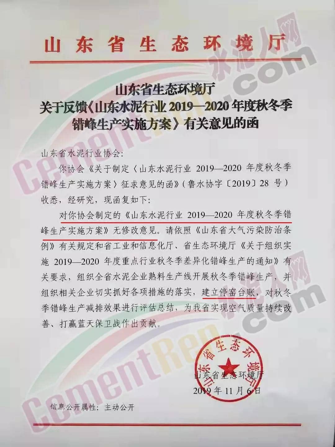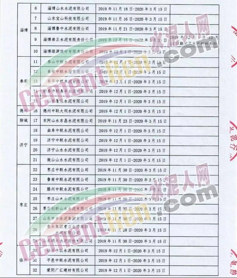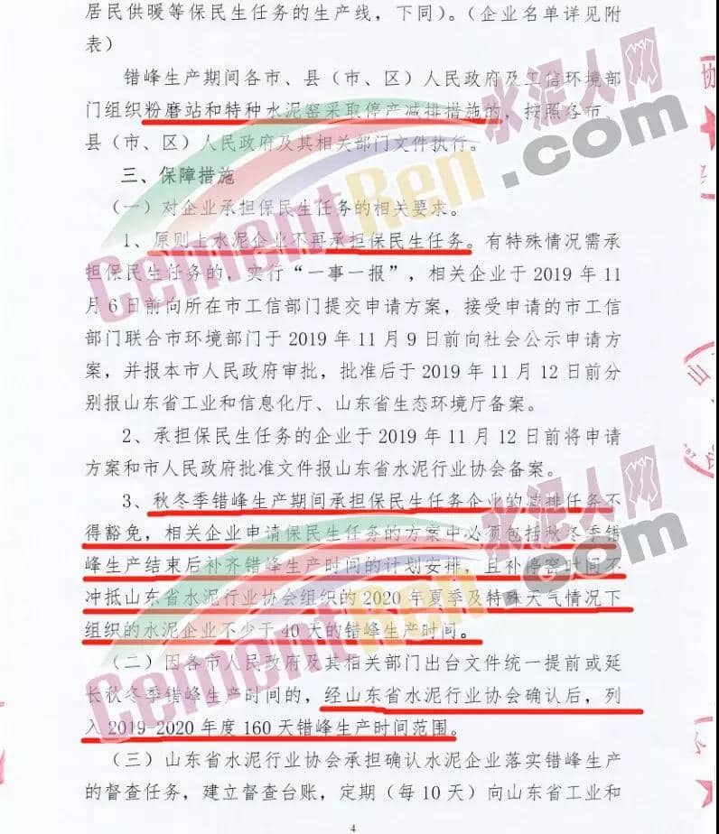 一、實(shí)施時(shí)間: 2019年11月15日0時(shí)-2020年3月15日24時(shí)。(2018年11月15日-2019年10月31日期間,積極落實(shí)秋冬季錯(cuò)峰生產(chǎn)、夏季錯(cuò)峰生及各市統(tǒng)一組織的環(huán)境污染減排任務(wù),錯(cuò)峰生產(chǎn)總時(shí)間超過160天的企業(yè),可按照實(shí)際超出天數(shù)延遲錯(cuò)峰生產(chǎn),但最遲應(yīng)于2019年12月1日0時(shí)開始實(shí)施錯(cuò)峰生產(chǎn),具體安排見附表。)二、實(shí)施對(duì)象: 山東水泥企業(yè)的熟料生產(chǎn)線(不含特種水泥窯,含建通窯,包括承擔(dān)處置危險(xiǎn)廢物、協(xié)同處置城市生活垃圾和污泥、居民供暖等保民生任務(wù)的生產(chǎn)線,下同)。(企業(yè)名單見附表); 錯(cuò)峰生產(chǎn)期間各市、縣(市、區(qū))人民政府及工信環(huán)境部門組織粉磨站和特種水泥窯采取停產(chǎn)減排措施的,按照各市、縣(市、區(qū))人民政府及相關(guān)部門文件執(zhí)行。三、保障措施 1、原則上水泥企業(yè)不再承擔(dān)保民生任務(wù)。有特殊情況需承擔(dān)民生任務(wù)的,實(shí)行“一事一報(bào)”,相關(guān)企業(yè)于2019年11月6日前向所在市工信部門提交申請(qǐng)方案,接受申請(qǐng)的市工信部門聯(lián)合市環(huán)境部門于2019年11月9日前向社會(huì)公示申請(qǐng)方案,并報(bào)本市人民政府審批,批準(zhǔn)后于2019年11月12日前分別報(bào)山東省工業(yè)和信息化廳、山東省生態(tài)環(huán)境廳備案。 2、承擔(dān)保民生任務(wù)的企業(yè)于2019年11月12日前將申請(qǐng)方案和市人民政府批準(zhǔn)文件報(bào)山東省水泥行業(yè)協(xié)會(huì)備案?! ?、秋冬季錯(cuò)峰生產(chǎn)期間承擔(dān)保民生任務(wù)企業(yè)的減排任務(wù)不得豁免,相關(guān)企業(yè)申請(qǐng)保民生任務(wù)的方案中必須包括秋冬季錯(cuò)峰生產(chǎn)結(jié)束后補(bǔ)齊錯(cuò)峰生產(chǎn)時(shí)間的計(jì)劃安排,且補(bǔ)停窯時(shí)間不沖抵山東省水泥行業(yè)協(xié)會(huì)組織的2020年夏季及特殊天氣情況下組織的水泥企業(yè)不少于40天的錯(cuò)峰生產(chǎn)時(shí)間。全文如下: