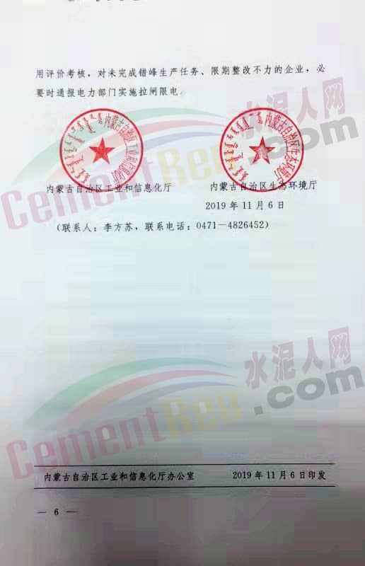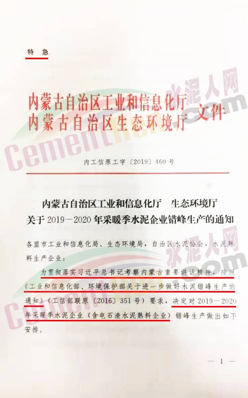 水泥人網(wǎng)消息:11月6日內(nèi)蒙古自治區(qū)工業(yè)和信息化廳、內(nèi)蒙古自治區(qū)生態(tài)環(huán)境廳發(fā)布了特急文件《關(guān)于2019-2020年采暖季水泥企業(yè)錯(cuò)峰生產(chǎn)》,通知稱:為了貫徹國(guó)家領(lǐng)導(dǎo)人考察內(nèi)蒙古重要講話精神,按照《工業(yè)化和信息化部、環(huán)境保護(hù)部關(guān)于進(jìn)一步做好水泥錯(cuò)峰生產(chǎn)的通知》(工信部聯(lián)原【2016】351號(hào))要求,決定對(duì)2019-2020年采暖季水泥企業(yè)(含電石渣水泥熟料企業(yè))錯(cuò)峰生產(chǎn)做出如下安排。