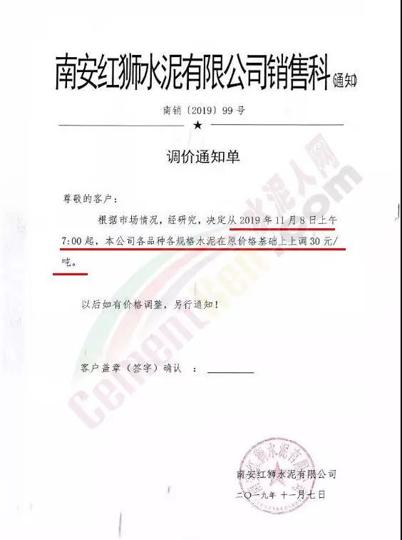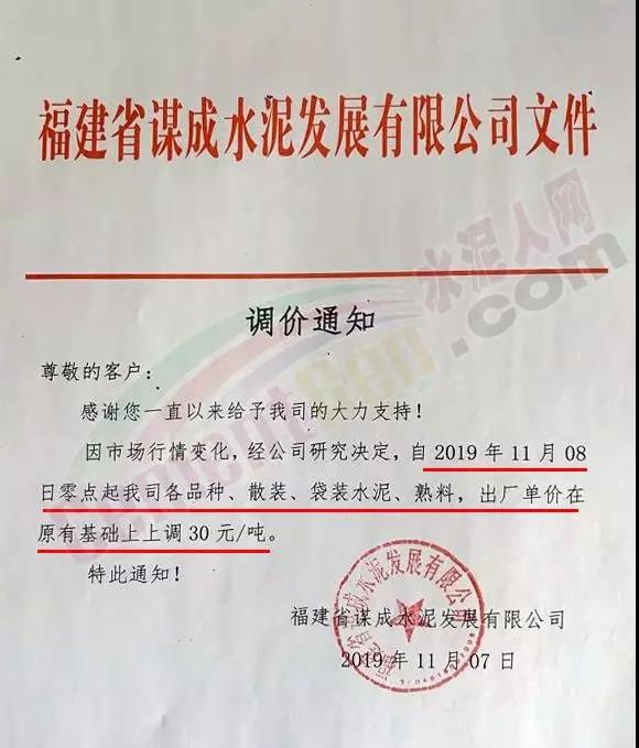 基于目前市場(chǎng)行情,結(jié)合我司實(shí)際情況,經(jīng)我公司研究決定,自2019年11月8日凌晨零時(shí)起,我公司發(fā)往福建省全區(qū)域的各品牌、品種袋裝、散裝水泥的出廠價(jià)格在原有基礎(chǔ)上上調(diào)30元/噸。