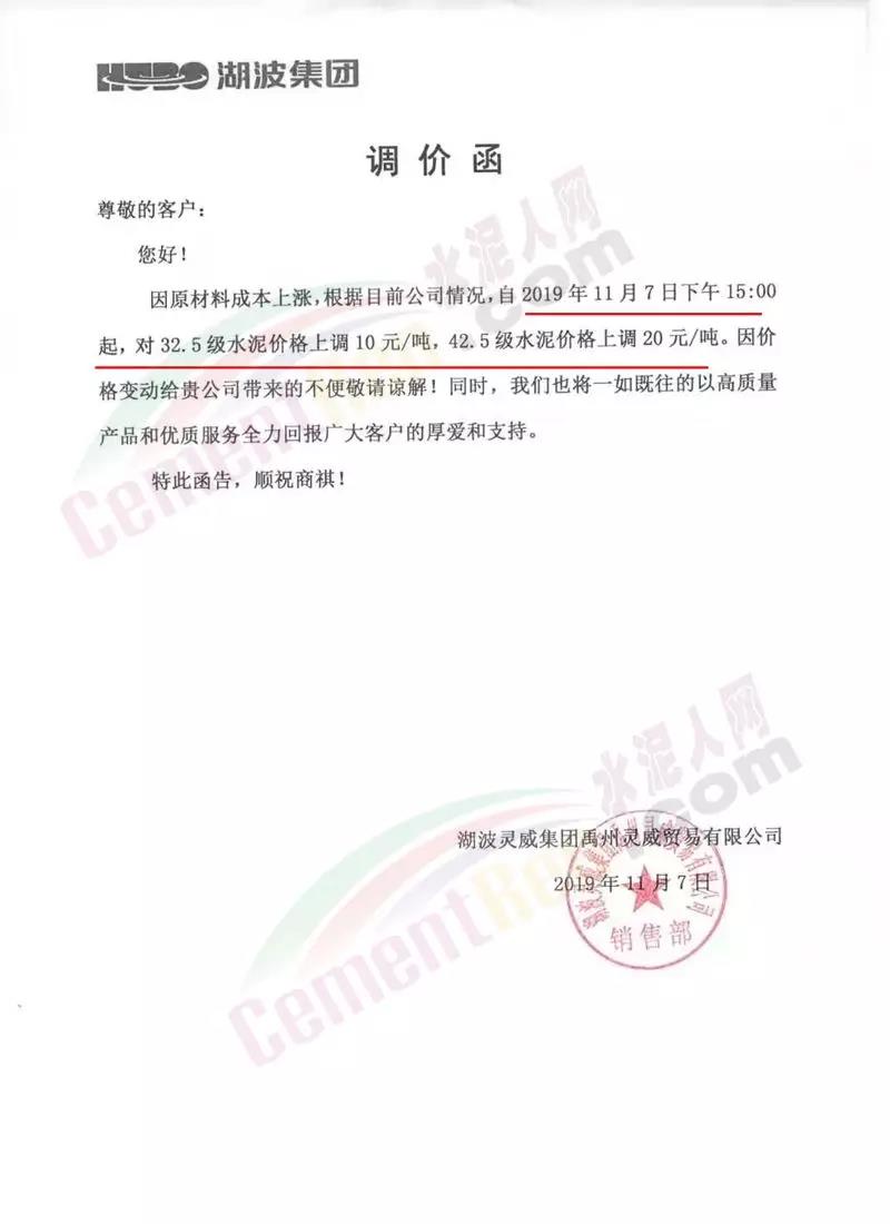 同期,區(qū)域主導(dǎo)企業(yè)湖波水泥也上調(diào)了水泥價(jià)格。調(diào)價(jià)通知如下: