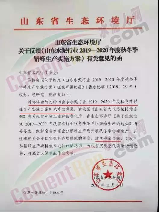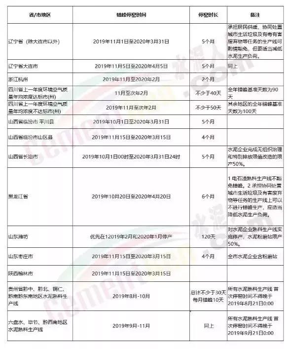 晉冀魯豫(京津冀2+26城市)即將停窯11月6日山東省水泥行業(yè)協(xié)會(huì)收到山東省生態(tài)環(huán)境廳的復(fù)函稱對(duì)其提交的2019-2020采暖季錯(cuò)峰生產(chǎn)計(jì)劃方案無(wú)修改意見(jiàn)。山東省區(qū)域內(nèi)熟料生產(chǎn)企業(yè)從2019年11月15日0時(shí)-2020年3月15日24時(shí)實(shí)施錯(cuò)峰生產(chǎn)。其中2018年11月15日-2019年10月31日期間,積極落實(shí)秋冬季錯(cuò)峰生產(chǎn)、夏季錯(cuò)峰生及各市統(tǒng)一組織的環(huán)境污染減排任務(wù),錯(cuò)峰生產(chǎn)總時(shí)間超過(guò)160天的企業(yè),可按照實(shí)際超出天數(shù)延遲錯(cuò)峰生產(chǎn),但最遲應(yīng)于2019年12月1日0時(shí)開(kāi)始實(shí)施錯(cuò)峰生產(chǎn)。據(jù)山東省65家熟料生產(chǎn)企業(yè)中有45家企業(yè)可延遲實(shí)施錯(cuò)峰生產(chǎn),山東水泥廠、棗莊中聯(lián)水泥等于11月30日起停限產(chǎn),泰安中聯(lián)、濟(jì)寧中聯(lián)、濟(jì)寧山水、臨沂中聯(lián)等自2019年12月1日起停限產(chǎn)。