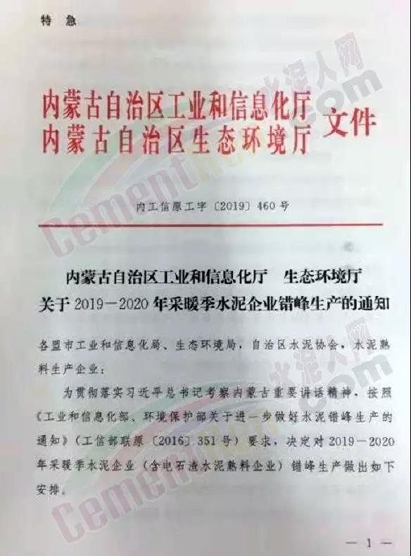 11月6日,內(nèi)蒙古自區(qū)工信廳聯(lián)合自治區(qū)生態(tài)環(huán)境廳一起發(fā)布特急文件《關(guān)于2019-2020年采暖季水泥企業(yè)錯(cuò)峰生產(chǎn)的通知》。文件要求內(nèi)蒙古自治區(qū)境內(nèi)所有水泥熟料生產(chǎn)企業(yè)包括利用電石渣生產(chǎn)水泥熟悉的企業(yè)停限產(chǎn)。且鼓勵(lì)水泥熟料企業(yè)在自愿的前提下,延長(zhǎng)增加錯(cuò)峰生產(chǎn)的時(shí)間。2019年至2020年度錯(cuò)峰生產(chǎn)時(shí)間為2019年11月15日至2020年3月15日共4個(gè)月全面實(shí)行錯(cuò)峰生產(chǎn)。