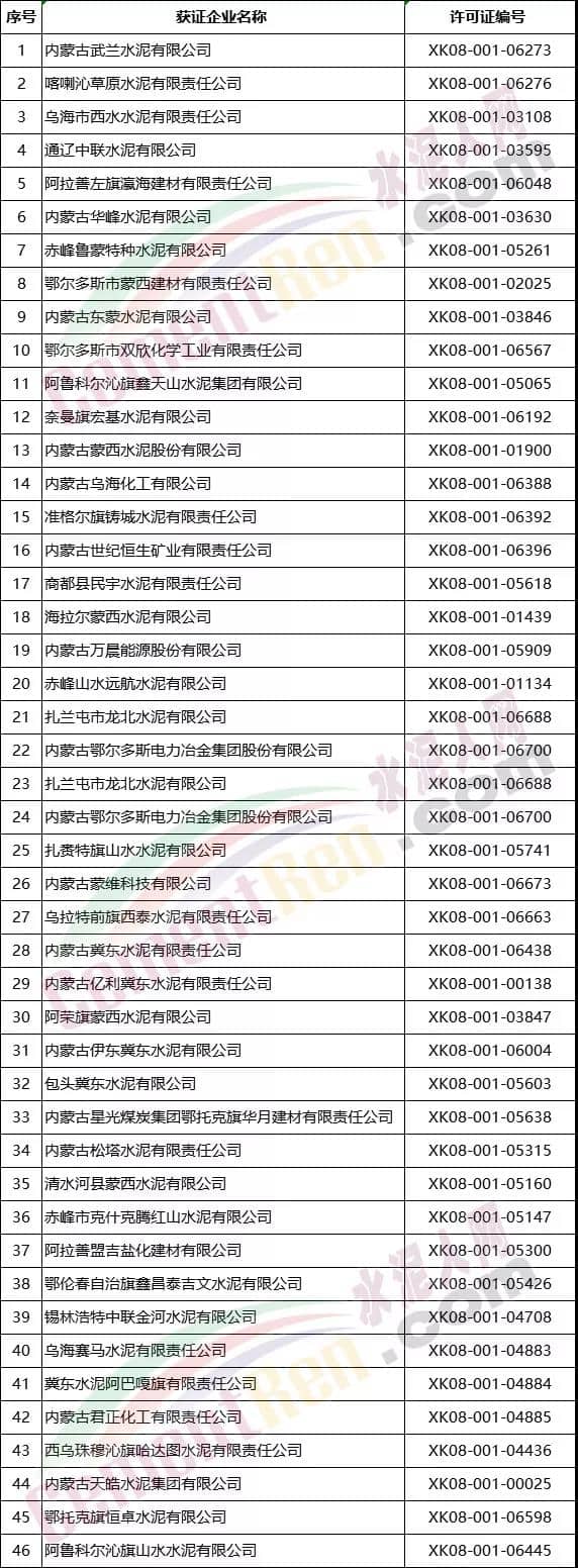 內(nèi)蒙古自治區(qū)部分水泥熟料生產(chǎn)企業(yè)名單