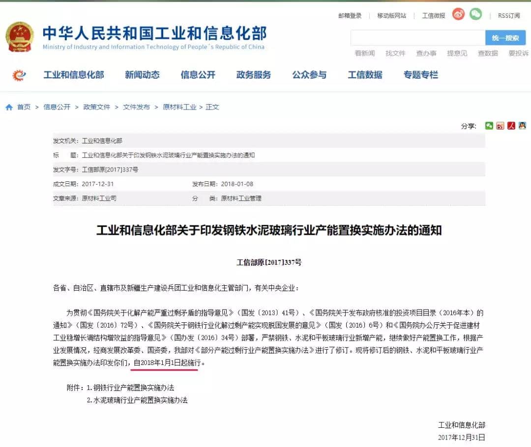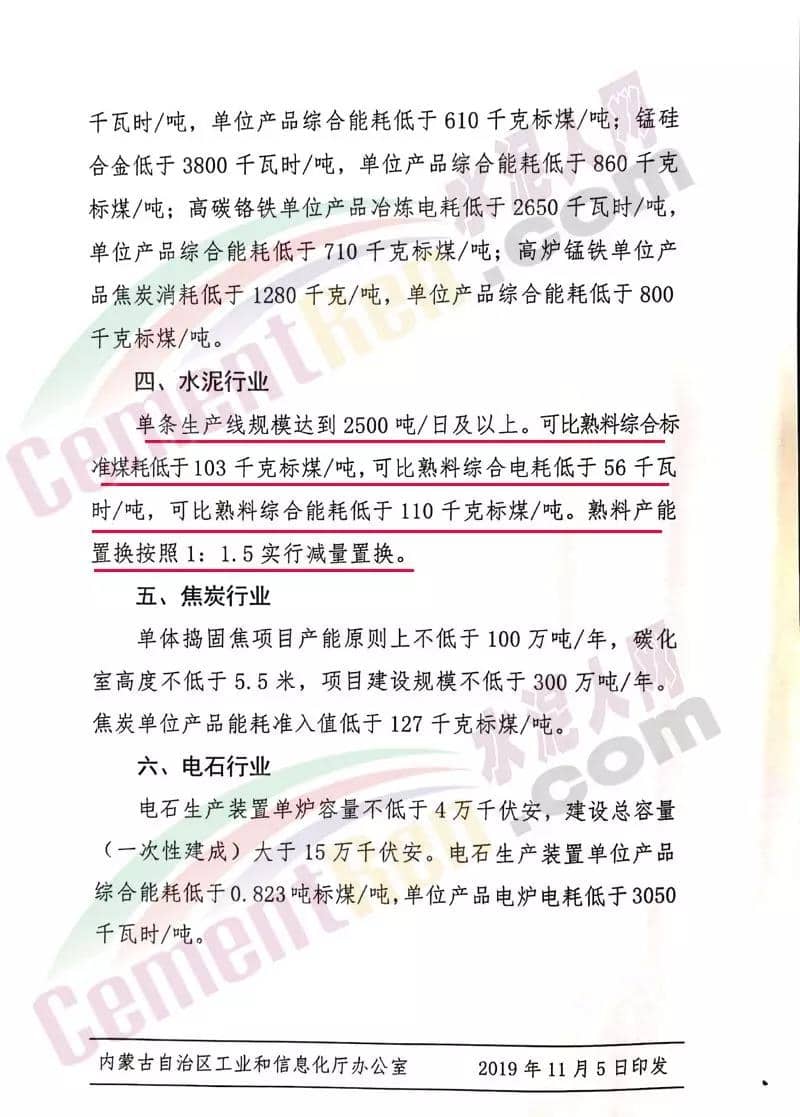 通知提到水泥行業(yè)單條生產(chǎn)線(xiàn)規(guī)模達(dá)到2500t/d及以上,可比熟料綜合標(biāo)準(zhǔn)煤耗低于103千克標(biāo)煤/噸,可比熟料綜合電耗低于56千瓦時(shí)/噸,可比熟料綜合能耗低于110千克標(biāo)煤/噸。熟料產(chǎn)能置換按照1:1.5實(shí)行減量置換。通知原文如下: