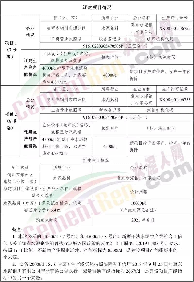 經(jīng)審核,冀東水泥銅川有限公司4000t/d新型干法熟料水泥生產(chǎn)線和4500t/d新型干法熟料水泥生產(chǎn)線符合“因當(dāng)?shù)匕l(fā)展規(guī)劃調(diào)整,導(dǎo)致不屬于國(guó)家明令淘汰的落后產(chǎn)能的生產(chǎn)裝置遷建的,且企業(yè)持有的生產(chǎn)許可證仍在有效期內(nèi),企業(yè)搬遷又未享受退出產(chǎn)能的資金獎(jiǎng)補(bǔ)和政策支持,企業(yè)承諾確不新增產(chǎn)能”要求。公示原文如下: