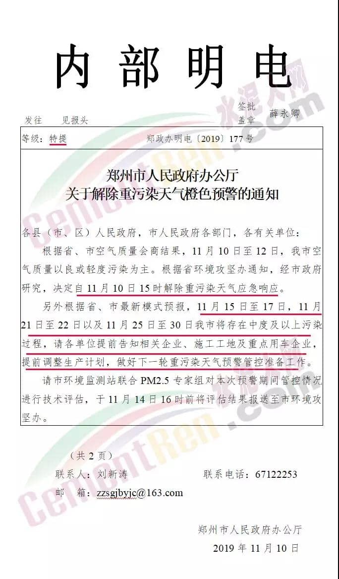 另外根據(jù)省、市最新模式預報,11月15日至17日,11月21日至22日以及11月25日至30日鄭州市將存在中度及以上污染過程,請各單位提前告知相關(guān)企業(yè)、施工工地及重點用車企業(yè),提前調(diào)整生產(chǎn)計劃,做好下一輪重污染天氣預警管控準備工作。文件原文如下: