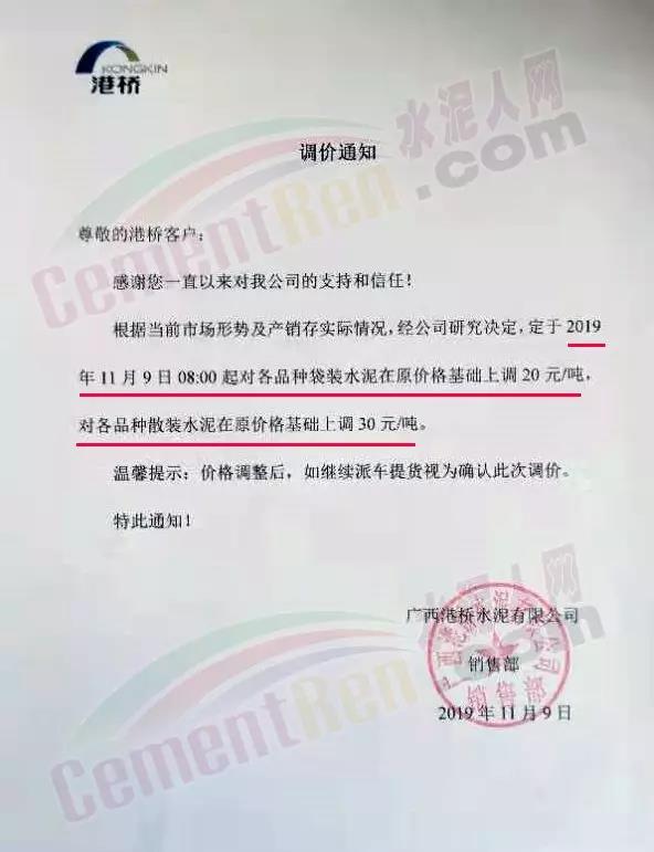 由于目前原材料上漲,成本升高的原因。故此將我廠品牌水泥:統(tǒng)一上調(diào)30元/噸。調(diào)整時間定于:2019年11月10日15點00分,謝謝!
