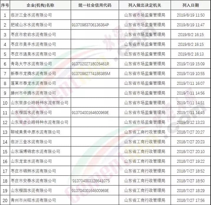 日前,水泥人網(wǎng)自信用中國(山東)獲悉,2018年7月至今僅山東省就有超過20家水泥企業(yè)被列入工商部門嚴重違法失信企業(yè)名單。2019年3月至今臨沂三金水泥有限公司、肥城山水水泥有限公司、棗莊市宏巖水泥有限公司、棗莊市奧豐水泥有限公司、棗莊市通奧水泥有限公司、青島大宇水泥有限公司、新泰市龍騰水泥有限公司、蓬萊市泰龍水泥有限公司、滕州市中騰水泥有限公司、山東里彥公路特種水泥有限公司、山東榴園水泥有限公司、山東里彥公路特種水泥有限公司等12家水泥企業(yè)被列入工商部門嚴重違法失信企業(yè)名單。名單如下: