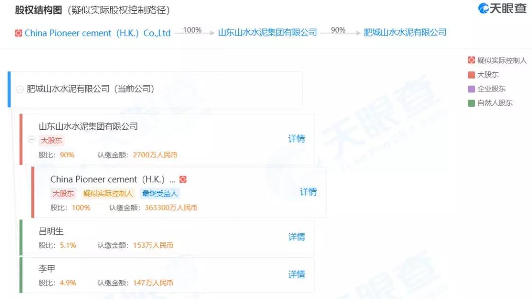 上述名單中2019年8月被列入的肥城山水水泥有限公司(生產(chǎn)許可證編號:XK08-001-05972),生產(chǎn)地址位于 山東省泰安市肥城市安站鎮(zhèn)站北村東。企業(yè)擁有1條粉磨生產(chǎn)線,關(guān)鍵設(shè)備為φ3.8×13m水泥磨機1臺。天眼查數(shù)據(jù)顯示,肥城山水水泥有限公司為山東山水水泥集團有限公司旗下控股子公司。股東結(jié)構(gòu)圖如下: