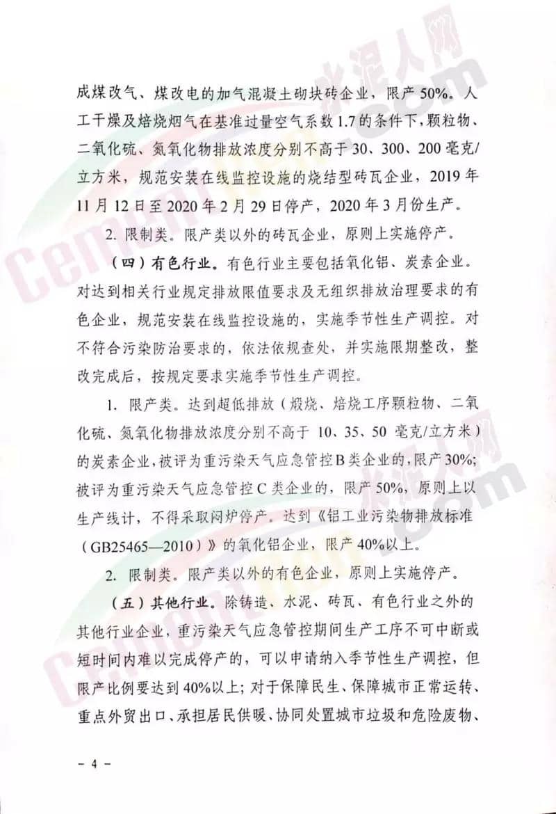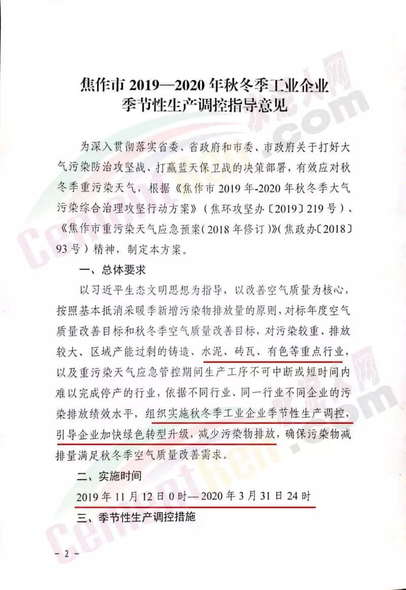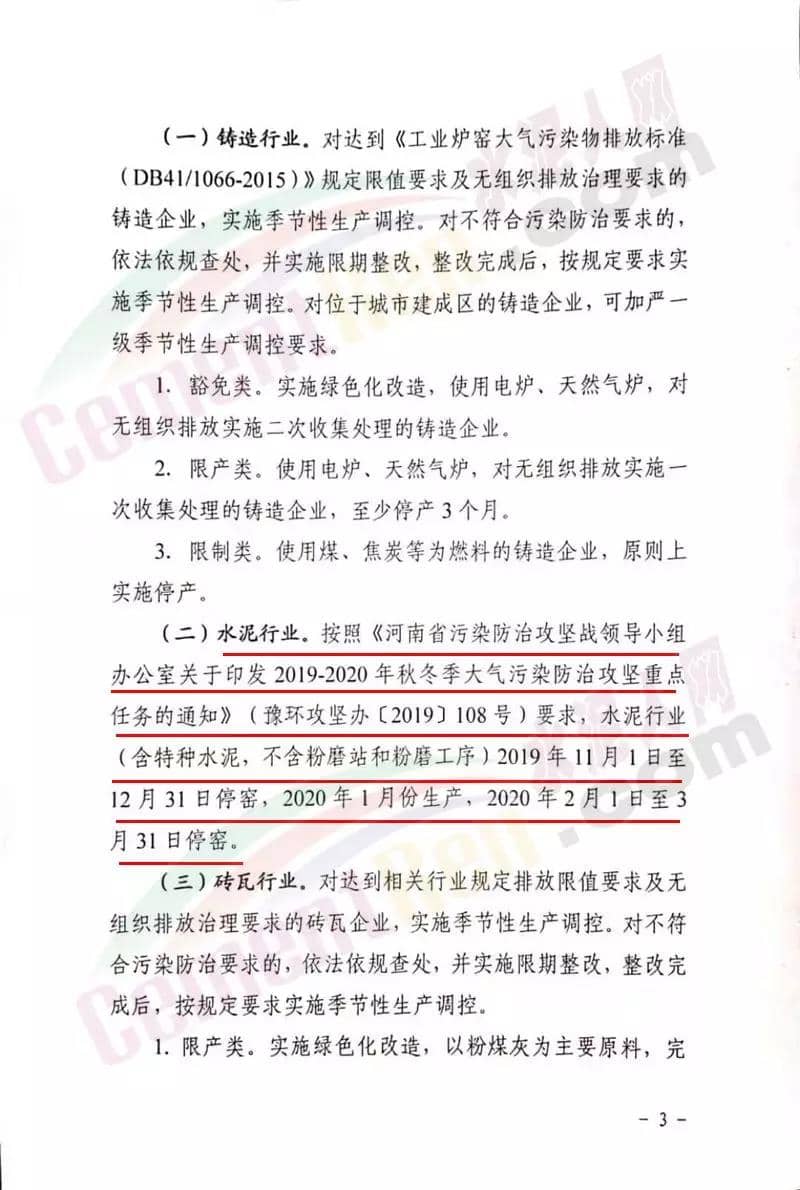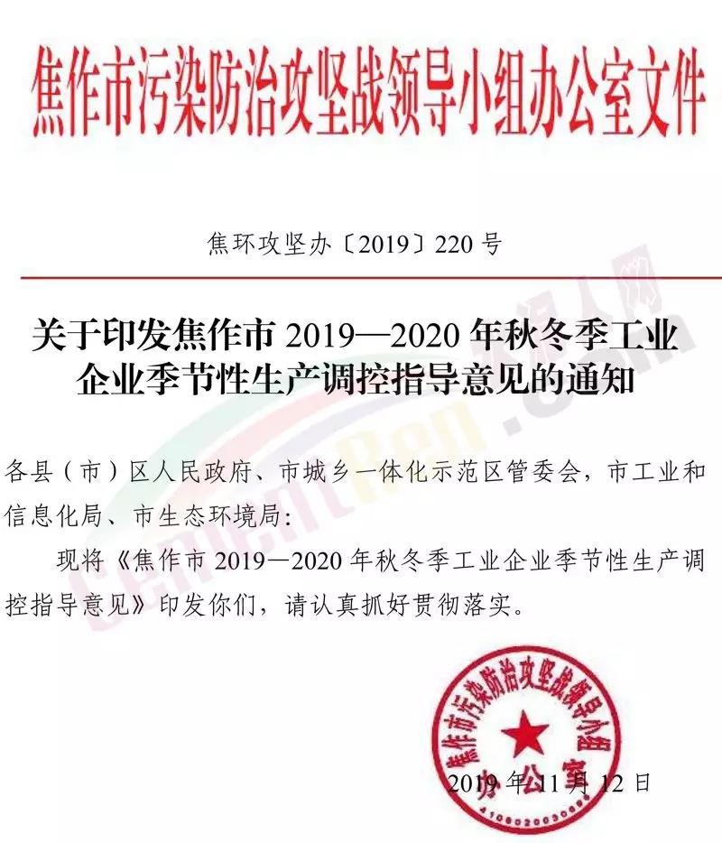 日前,焦作市污染物防治攻堅戰(zhàn)領導小組辦公室發(fā)布《關于印發(fā)焦作市 2019—2020 年秋冬季工業(yè)企業(yè)季節(jié)性生產(chǎn)調(diào)控指導意見的通知》。其中《焦作市 2019—2020 年秋冬季工業(yè)企業(yè)季節(jié)性生產(chǎn)調(diào)控指導意見的通知》要求水泥、磚瓦、有色等重點行業(yè),以據(jù)不同行業(yè),同一行業(yè)不同企業(yè)的污染排放績效水平,組織實施秋冬季工業(yè)企業(yè)季節(jié)性生產(chǎn) 調(diào)控,引導企業(yè)加快綠色轉(zhuǎn)變型升級,減少污染物排放,確保污染物減排量滿足秋冬季空氣質(zhì)量改善需求。實施時間:2019年11月12日0時至2020年3月31日24時季節(jié)性生產(chǎn)調(diào)控措施要求水泥行業(yè),按照《河南省污染防治攻堅戰(zhàn)領導小組辦公室關于印發(fā)2019-2020年秋冬季大氣污染防治攻堅重點任務的通知》要求,水泥行業(yè)(含特種水泥、不含粉磨站和粉磨工序)2019年11月1日至12月31日停窯,2020年1月份生產(chǎn),2020年2月1日至3月31日停窯。對于保障民生、保障城市 正常運轉(zhuǎn)、重點外貿(mào)出口、承擔居民供暖、協(xié)同處置城市垃圾和危險廢物等項目可以申請納入季節(jié)性生產(chǎn)調(diào)控保障類,但需要根據(jù)任務量確定需豁免停限產(chǎn)的生產(chǎn)量。通知原文如下: