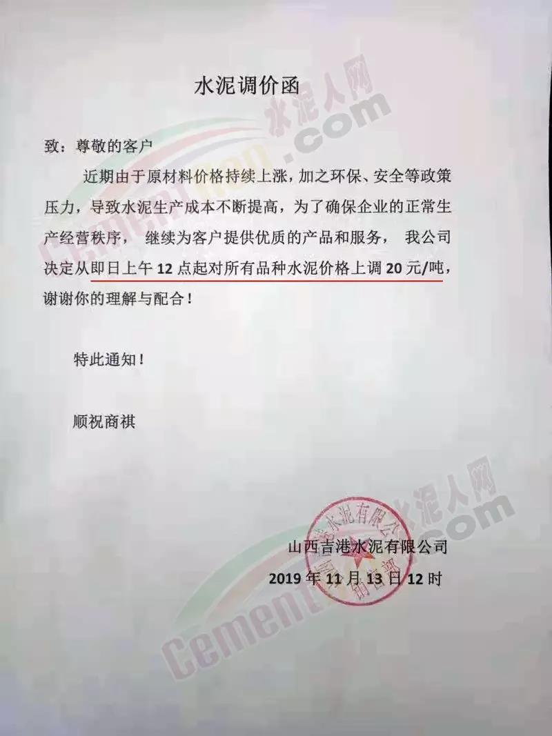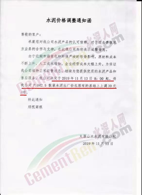太原山水水泥有限公司水泥價(jià)格調(diào)整通知函稱,由于近期市場(chǎng)變化和環(huán)保嚴(yán)峻的形勢(shì)影響,原材料成本不斷上升、人工成本增加,企業(yè)經(jīng)營(yíng)成本大升。為保證公司維持正常經(jīng)營(yíng)狀態(tài),公司決定于11月13日8時(shí)起將公司P.O42.5散裝水泥出廠價(jià)在原有的基礎(chǔ)上上調(diào)30元/噸。