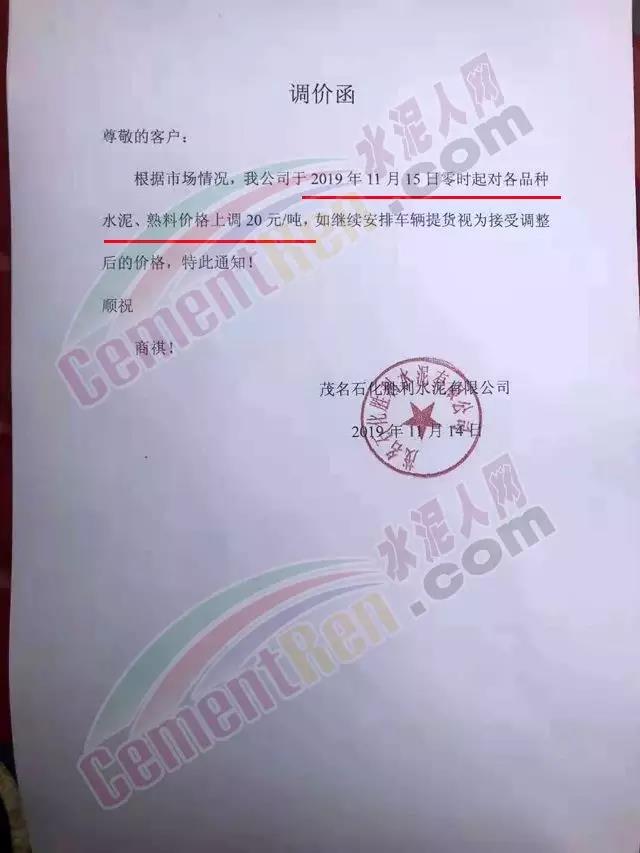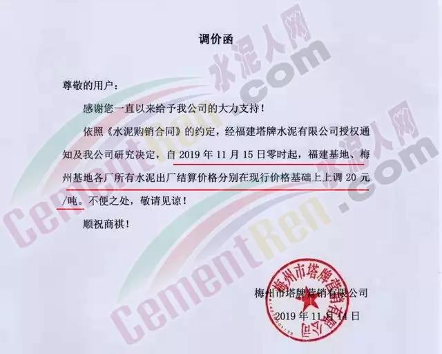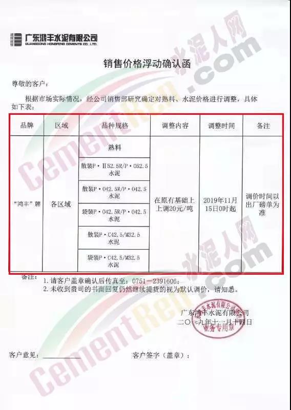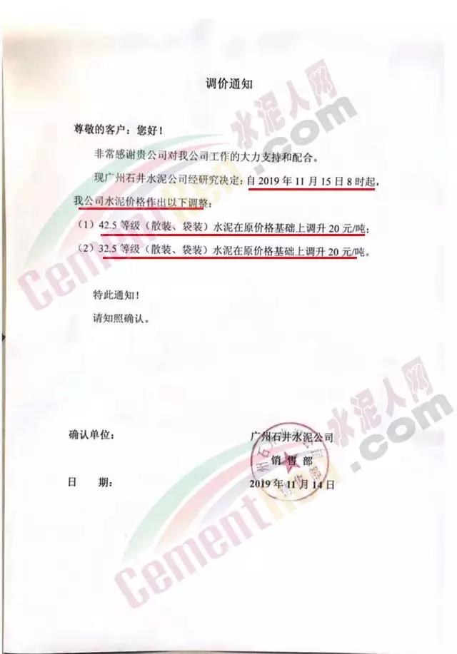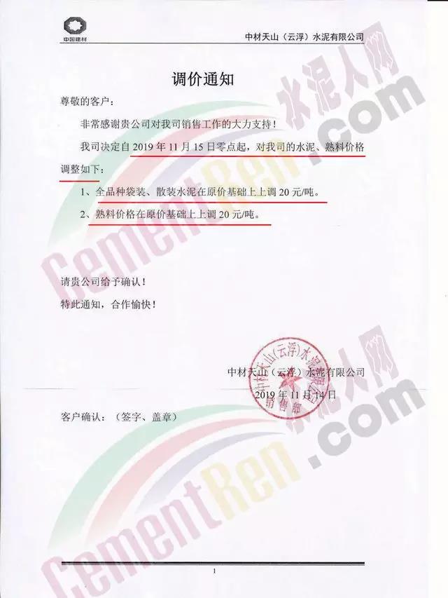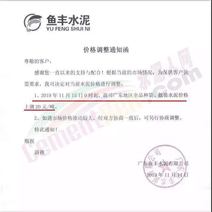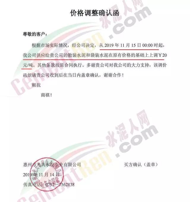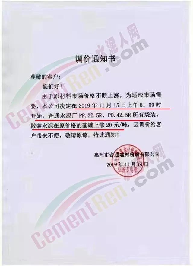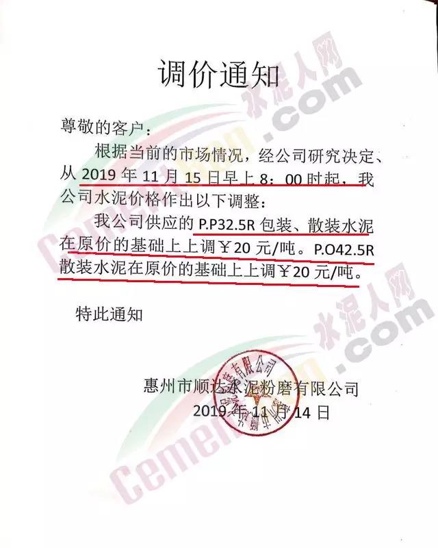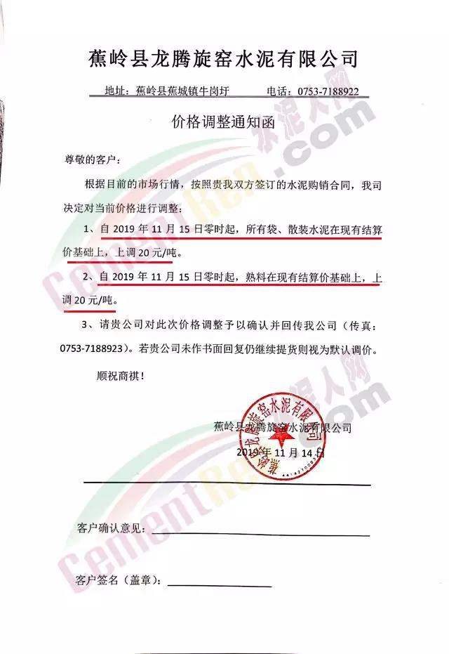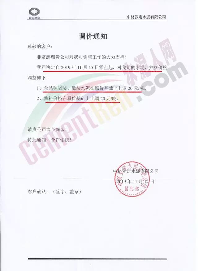 尊敬的客戶:根據(jù)市場(chǎng)行情及公司原材料庫(kù)存與進(jìn)項(xiàng)變化,我公司自2019年11月14日八點(diǎn)時(shí)起:對(duì)32.5級(jí)散裝水泥在原有的價(jià)格基礎(chǔ)上每噸上調(diào)30元,袋裝每噸上調(diào)30元。(滁州金瑞水泥有限公司)
