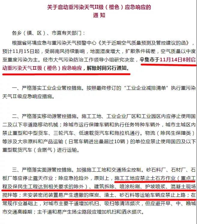 山東、河北、山西多省發(fā)布天氣橙色預警除此之外,山東濟南,河北邯鄲、衡水、辛集、石家莊、邢臺,山西省高平、晉城、呂梁等地也陸續(xù)發(fā)布了重污染天氣橙色預警。據(jù)水泥人網(wǎng)了解,啟動重污染天氣橙色預警之后,礦山、砂石料廠、石材廠、石板廠等應停止露天作業(yè);除應急搶險外,施工工地應禁止土石方作業(yè)、建筑拆除、噴涂粉刷、護坡噴漿、混凝土攪拌等;未安裝密閉裝置易產(chǎn)生遺撒的煤炭、渣土、砂石料等運輸車輛應禁止上路;在常規(guī)作業(yè)基礎上,對城市主要干道增加機掃、濕掃等清潔頻次,但應避開早、中、晚城市交通高峰期。據(jù)相關人士介紹,山東棗莊市委書記親自帶頭深入各企業(yè),嚴查各區(qū)域里企業(yè)、工地的停工停產(chǎn)情況。