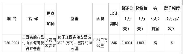 根據(jù)江西省自然資源廳國土資源交易中心早前發(fā)布的公告,江西省德安縣付山水泥用灰?guī)r礦普查探礦權(quán)起拍價(jià)為14831萬元,本次萬年青水泥通過多輪角逐后最終以57761萬元報(bào)價(jià)競拍成功。