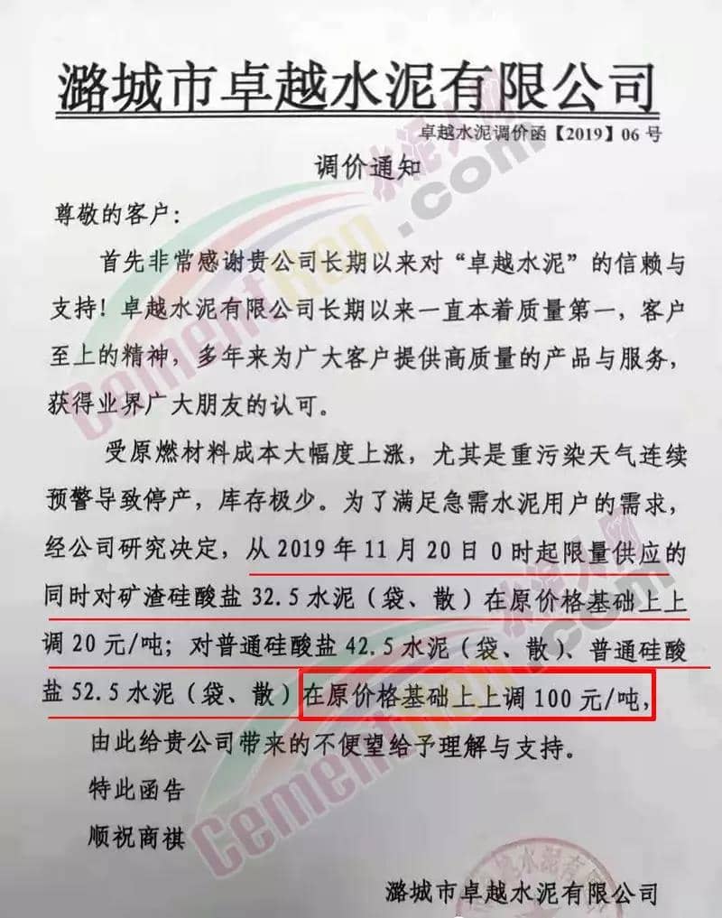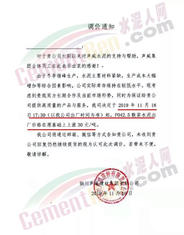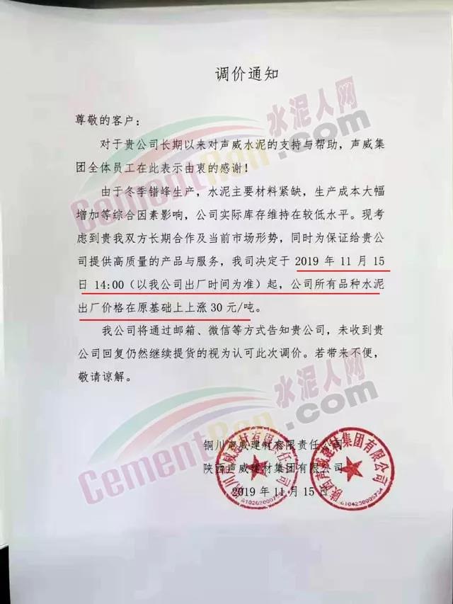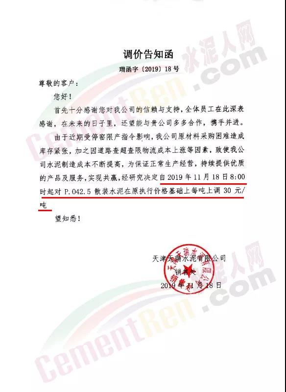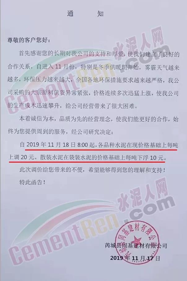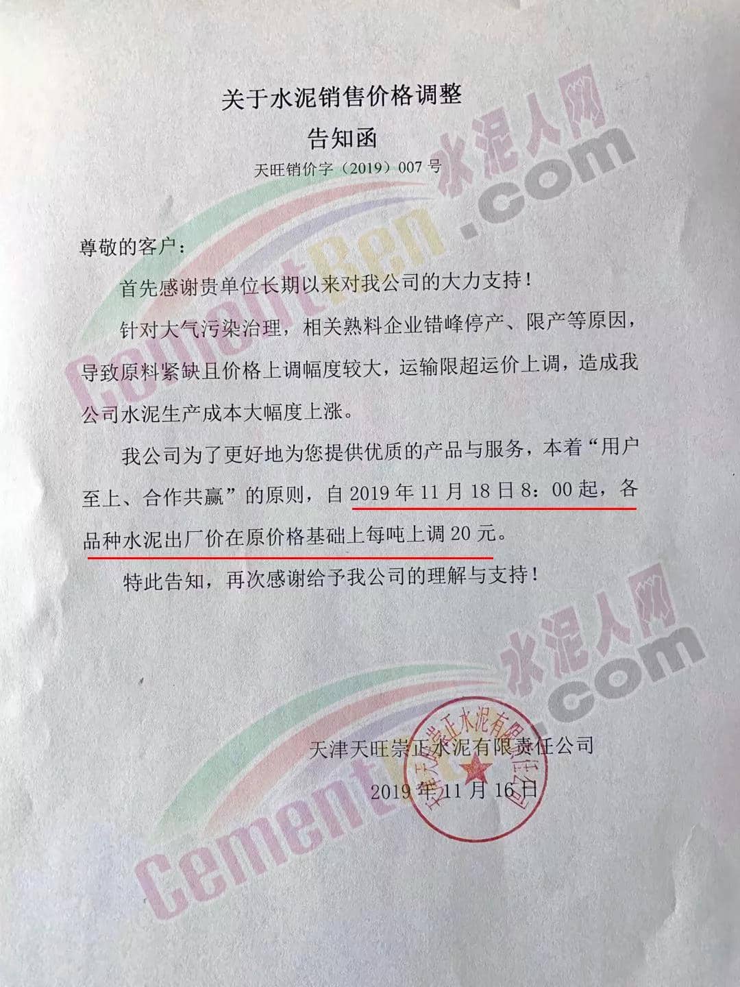 天津天旺崇正水泥有限責(zé)任公司關(guān)于水泥銷售主價格調(diào)整的告知函稱,針對大氣污染治理,相關(guān)熟料企業(yè)錯峰停產(chǎn)、限產(chǎn)等原因?qū)е略暇o缺且價格上調(diào)幅度較大,運輸限超運價上調(diào),造成我公司水泥生產(chǎn)成本大幅度上漲。公司決定自11月18日8時起各品種水泥出廠價在原價格基礎(chǔ)上每噸上調(diào)20元。