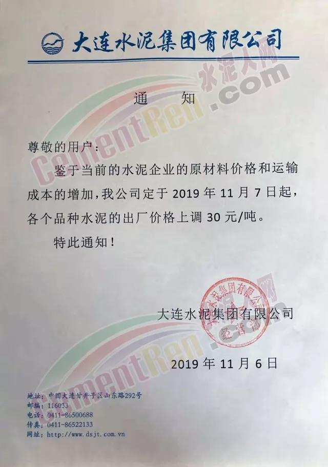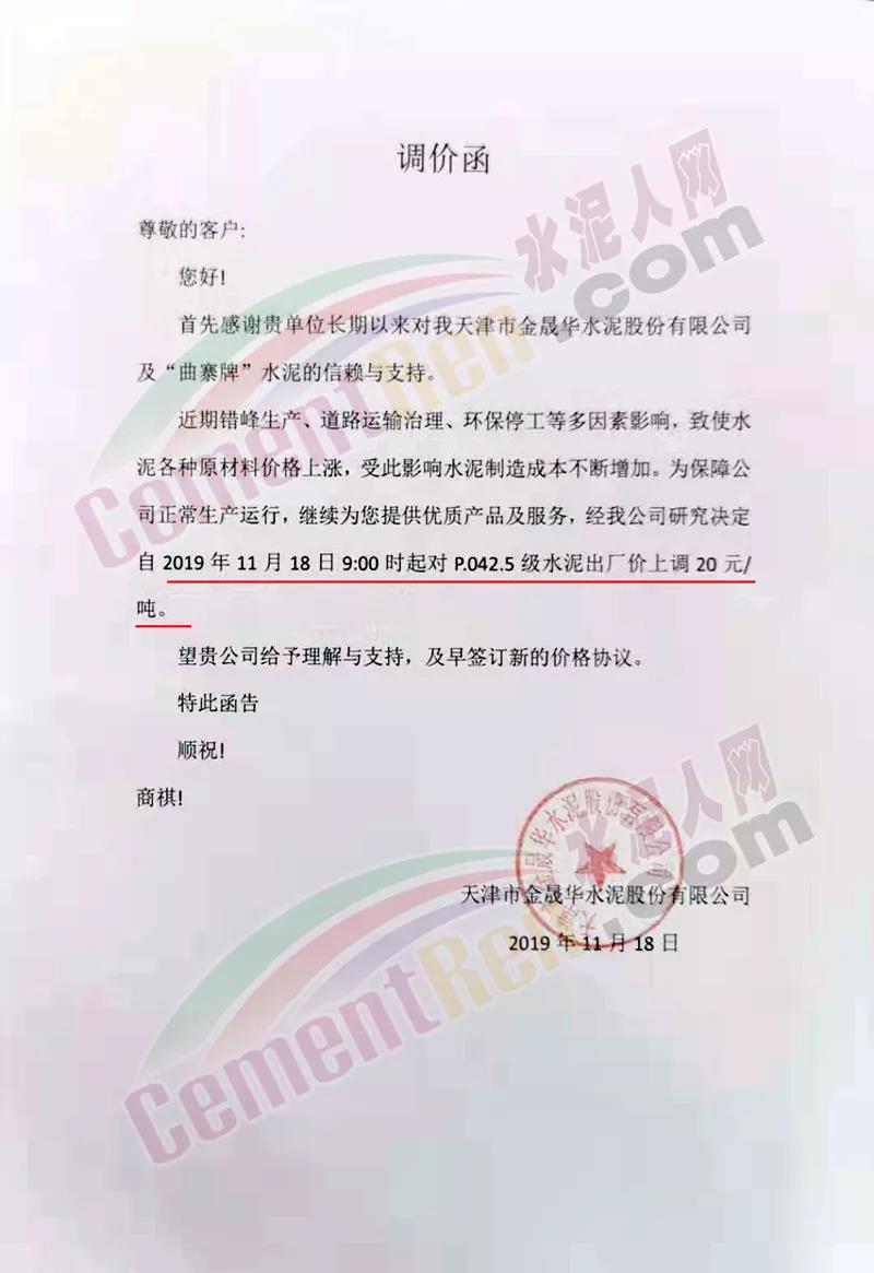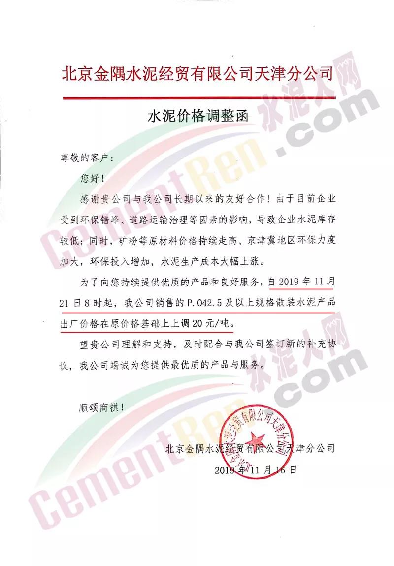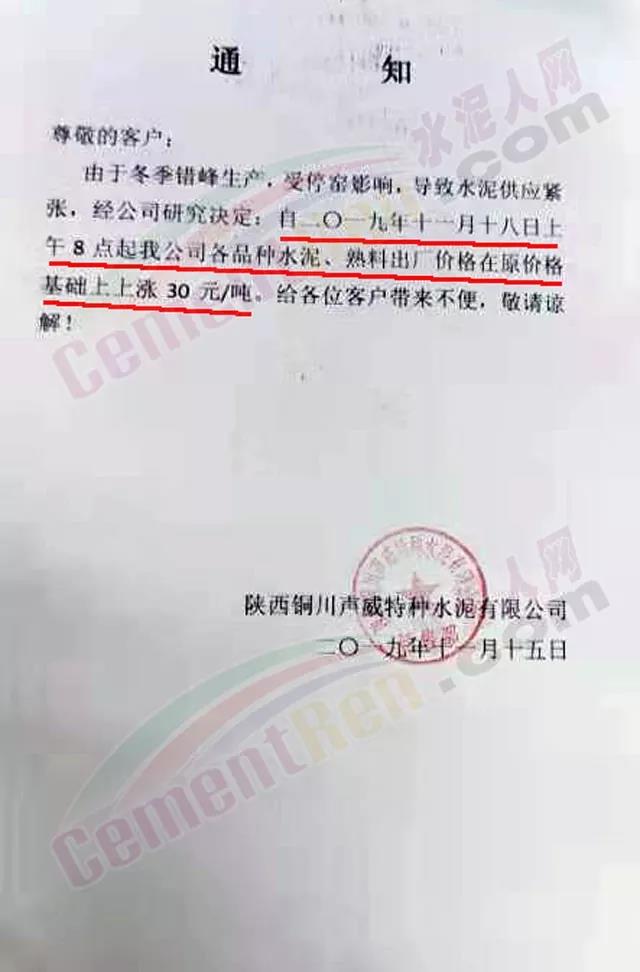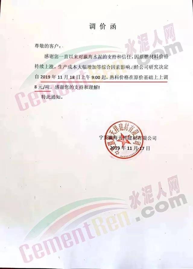 天津天旺崇正水泥有限責(zé)任公司關(guān)于水泥銷售主價格調(diào)整的告知函稱,針對大氣污染治理,相關(guān)熟料企業(yè)錯峰停產(chǎn)、限產(chǎn)等原因?qū)е略暇o缺且價格上調(diào)幅度較大,運輸限超運價上調(diào),造成我公司水泥生產(chǎn)成本大幅度上漲。公司決定自11月18日8時起各品種水泥出廠價在原價格基礎(chǔ)上每噸上調(diào)20元。