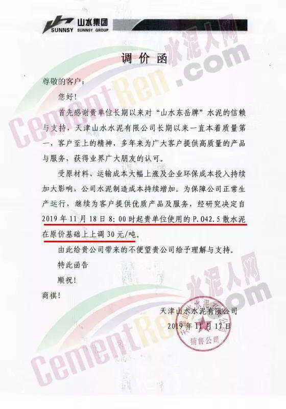 天津山水水泥調(diào)價函稱,受原材料、運輸成本大幅上漲及企業(yè)環(huán)保成本投入持續(xù)加大影響,公司水泥制造成本持續(xù)增加。為保障公司正常生產(chǎn)運行,繼續(xù)為客戶提供優(yōu)質(zhì)產(chǎn)品服務(wù),經(jīng)研究決定自11月18日8時起PO42.5散裝水泥價格在原價格基礎(chǔ)上上調(diào)30元/噸。