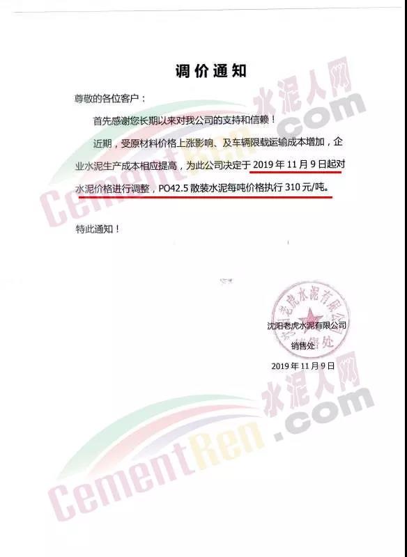 天津市金晟華水泥股份有限公司調(diào)價通知稱,近期錯峰生產(chǎn),道路運輸治理、環(huán)保停工等多因素影響,致使水泥各種原材料價格上漲,受此影響水泥制造成本不斷增加,為保障公司正常生產(chǎn)運行,經(jīng)公司研究決定自11月18日9時起對PO42.5級水泥出廠價上調(diào)20元/噸。