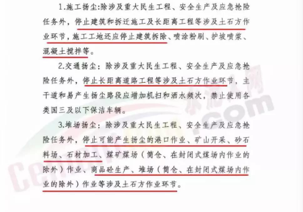 3.除涉及重大民生工程、安全生產(chǎn)及應(yīng)急搶險(xiǎn)任務(wù)外,停止所有施工工地的土石方作業(yè)(包括停止土石方開挖、回填、場(chǎng)內(nèi)倒運(yùn)、摻拌石灰、混凝土剔鑿等作業(yè),停止建筑工程配套道路和管溝開挖作業(yè))。