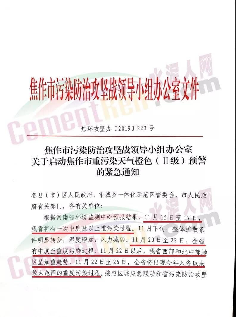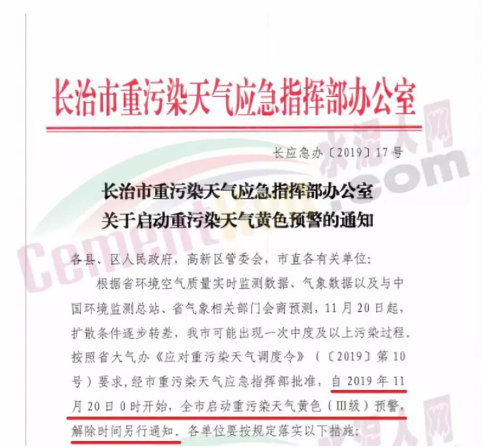 長(zhǎng)治市重污染天氣應(yīng)急指按部辦公室通知文件要求自11月20日0時(shí)開始全市啟動(dòng)重污染天氣黃色(III級(jí))預(yù)警,要求水泥、建材行業(yè)停產(chǎn)。
