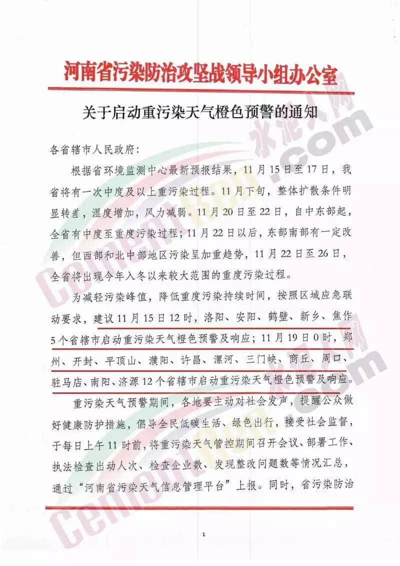 河南南省污染防治攻堅(jiān)戰(zhàn)領(lǐng)導(dǎo)小組辦公室建議今日11月15日12時(shí),洛陽(yáng)、安陽(yáng)、鶴壁、新鄉(xiāng)、焦作5個(gè)省轄市啟動(dòng)重污染天氣橙色預(yù)警及響應(yīng);11月19日0時(shí),鄭州、開封、平頂山、濮陽(yáng)、許昌、漯河、三門峽、商丘、周口、駐馬店、南陽(yáng)、濟(jì)源12個(gè)省轄市啟動(dòng)重污染天氣橙色預(yù)警及II響應(yīng)。