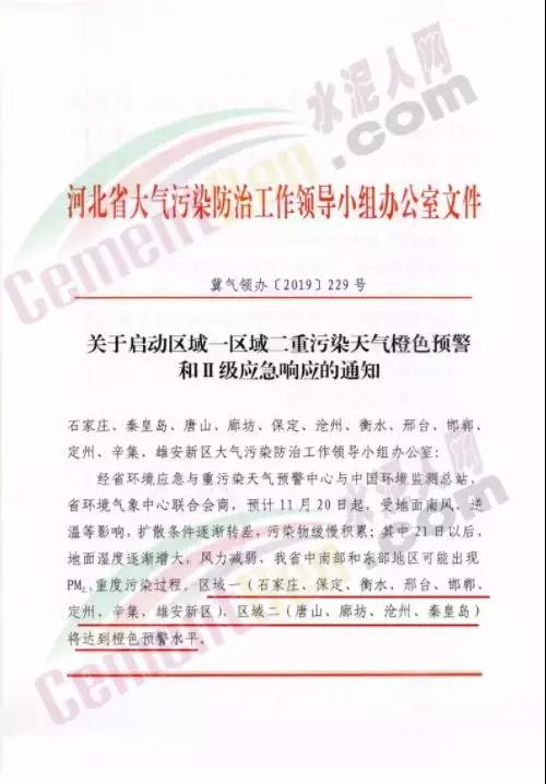 以河北省的“水泥窩”唐山市為例,當(dāng)?shù)卣?1月19日發(fā)布了《關(guān)于啟動(dòng)重污染天氣Ⅱ級(jí)應(yīng)急響應(yīng)的通知》稱自2019年11月19日20時(shí),全市啟動(dòng)重污染天氣Ⅱ級(jí)應(yīng)急響應(yīng)。