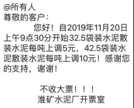 淮北市天助水泥公司通知稱:由于原材料價(jià)格上漲且供應(yīng)緊張,經(jīng)公司研究決定自2019年11月20日早上八點(diǎn)起,所以品種袋散價(jià)格上調(diào)10元每噸。