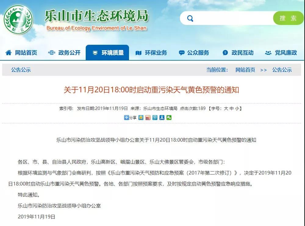 四川樂(lè)山市11月20日啟動(dòng)重污染天氣黃色預(yù)警