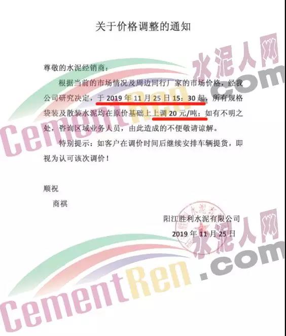 陽江勝利水泥有限公司發(fā)布了關(guān)于價(jià)格調(diào)整通知稱,根據(jù)當(dāng)前的市場(chǎng)情況及周邊同行廠家的市場(chǎng)價(jià)格,于2019年11月25日15:30起,所有規(guī)格袋裝及散裝水泥均在原價(jià)基礎(chǔ)上上調(diào)20元/噸。