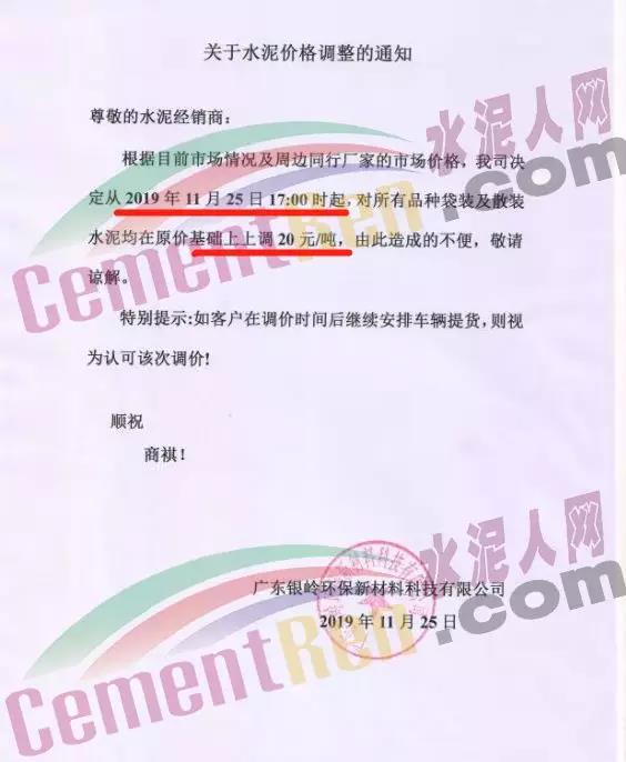 廣東銀鈴環(huán)保新材料科技有限公司發(fā)布了關(guān)于水泥價(jià)格調(diào)整的通知稱,根據(jù)市場(chǎng)情況及周邊同行廠家的市場(chǎng)價(jià)格,決定從2019年11月25日17:00時(shí)起,對(duì)所有品種袋裝及散裝水泥均在原價(jià)基礎(chǔ)上上調(diào)20元/噸。
