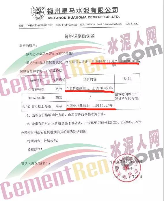 梅州市皇馬水泥有限公司發(fā)布了價(jià)格調(diào)整確認(rèn)函,根據(jù)當(dāng)前市場(chǎng)情況變化,決定自2019年11月26日00:00時(shí)起,全品種等級(jí)散裝在原價(jià)基礎(chǔ)上,上調(diào)30元/噸,P.O42.5及以上等級(jí)袋裝在原價(jià)格基礎(chǔ)上,上調(diào)10元/噸。