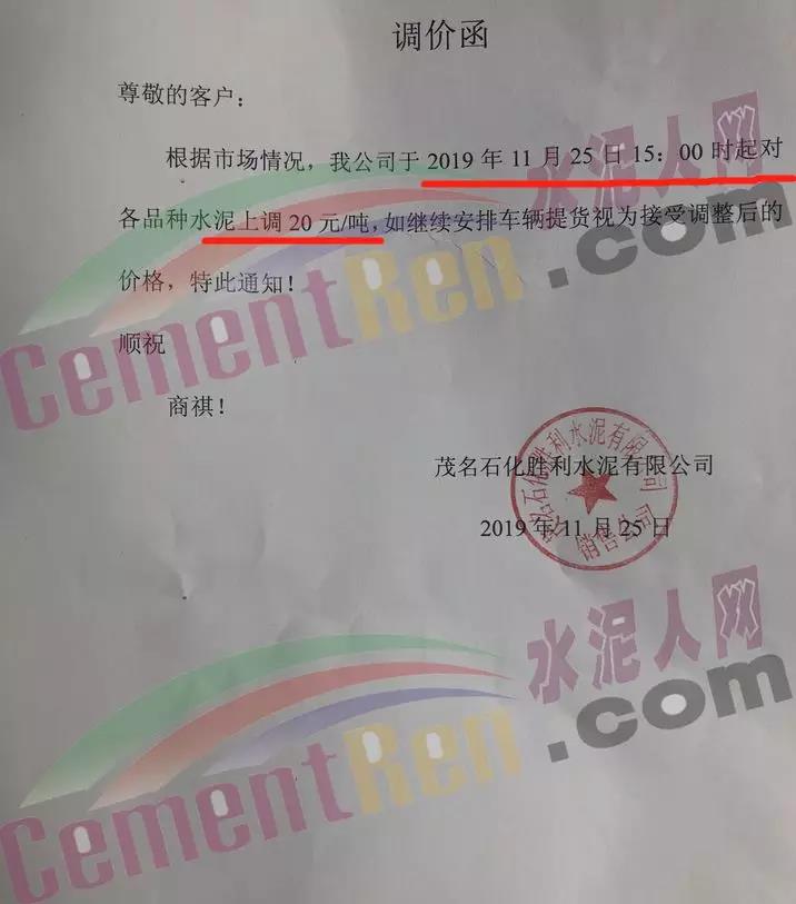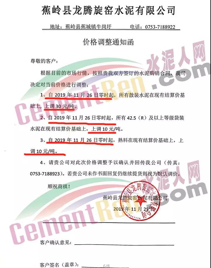 梅州市塔牌營(yíng)銷有限公司發(fā)布了調(diào)價(jià)函稱,依照《水泥購銷合同》的約定,決定自2019年11月26日零時(shí)起,福梅基地各廠除P.II42.5(R)外其余所有散裝水泥出廠結(jié)算價(jià)格在現(xiàn)行價(jià)格基礎(chǔ)上上調(diào)30元/噸,散裝P.II42.5(R)品種等級(jí)水泥出廠結(jié)算價(jià)格在現(xiàn)行價(jià)格基礎(chǔ)上上調(diào)40元/噸,蕉嶺分公司、鑫達(dá)分公司所有袋裝水泥出廠結(jié)算價(jià)格分別在現(xiàn)行價(jià)格基礎(chǔ)上上調(diào)10元/噸。