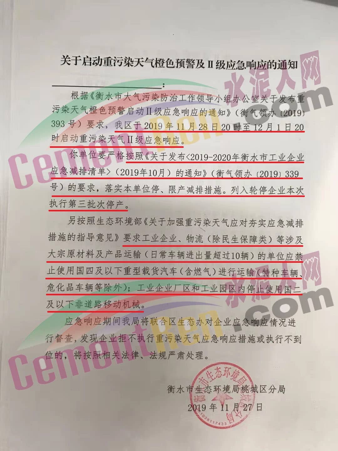 強制性污染減排措施要求工業(yè)企業(yè)嚴格執(zhí)行《關于發(fā)布〈2019-2020年衡水市工業(yè)企業(yè)應急減排清單〉(2019年10月)的通知》(衡氣領辦〔2019〕339號)的清單中橙色預警減排措施。施工工地、工業(yè)企業(yè)廠區(qū)和工業(yè)園區(qū)內(nèi)禁止使用國二及以下的非道路移動機械(除清潔能源和緊急檢修作業(yè))、不達標的非道路移動機械,建筑垃圾和渣土運輸車、砂石運輸車輛禁止上路行駛。按照生態(tài)環(huán)境部《關于加強重污染天氣應對夯實應急減排措施的指導意見》要求工業(yè)企業(yè)、物流(除民生保障類)等涉及大宗原材料及產(chǎn)品運輸(日常車輛進出量超過10輛)的單位應禁止使用國四及以下重型載貨汽車(含燃氣)進行運輸(特種車輛、?;奋囕v等除外)。