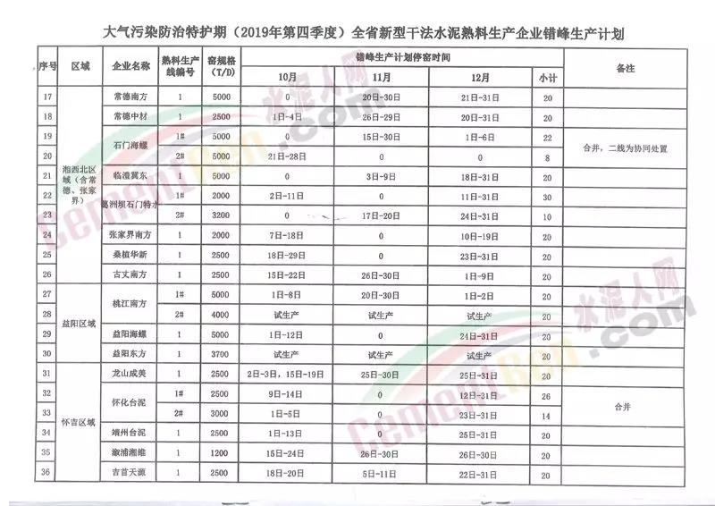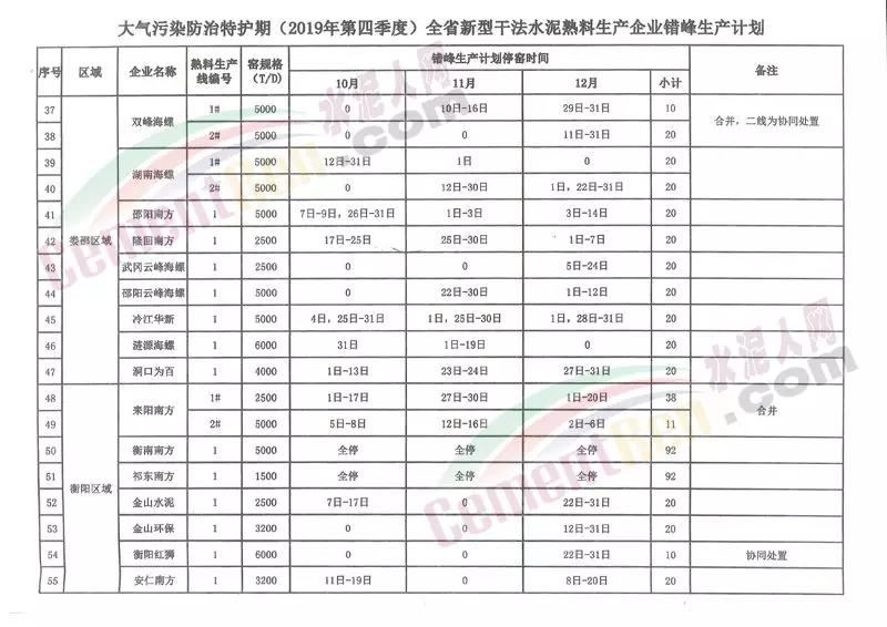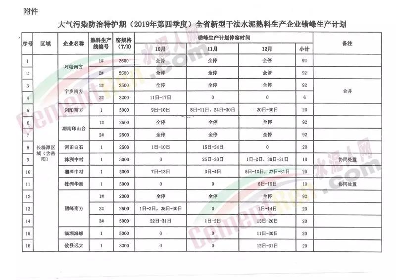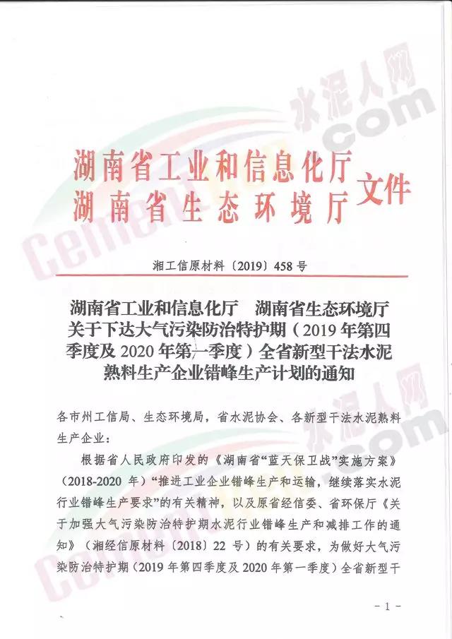 四季度日前,湖南省工信廳聯(lián)合生態(tài)環(huán)境廳發(fā)布《關于下達大氣污染防治特護期(2019年第四季度及2010年第一季度)全省新型干法水泥熟料生產(chǎn)企業(yè)錯峰生產(chǎn)計劃的通知》稱,根據(jù)湖南省政府印發(fā)的《湖南省“藍天保衛(wèi)戰(zhàn)”實施方案》(2018-2020年)“推進工業(yè)企業(yè)錯峰生產(chǎn)和運輸,繼續(xù)落實水泥行業(yè)錯峰生產(chǎn)要求”的有關精神以及原省經(jīng)信委、省環(huán)保廳《關于加強大氣污染防治特護期水泥行業(yè)錯峰生產(chǎn)和減排工作的通知》有關要求,為做好大氣污染防治特護期全省新型干法水泥熟料生產(chǎn)企業(yè)錯峰生產(chǎn)工作。其中2019年四季度按照協(xié)會編制的計劃執(zhí)行。2020年一季度各新型干法水泥熟料生產(chǎn)企業(yè)按照錯峰停窯不少于40天。重點區(qū)域長株潭及岳陽、常德 、益陽和衡陽市的企業(yè)不少于45天執(zhí)行。承擔垃圾協(xié)同處置任務的熟料生產(chǎn)線減半執(zhí)行。通知原文如下: