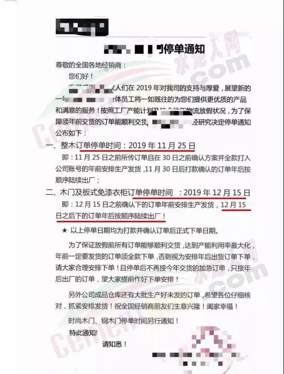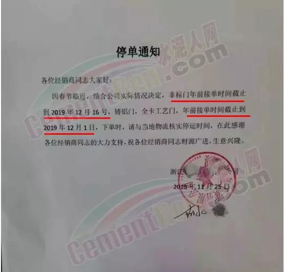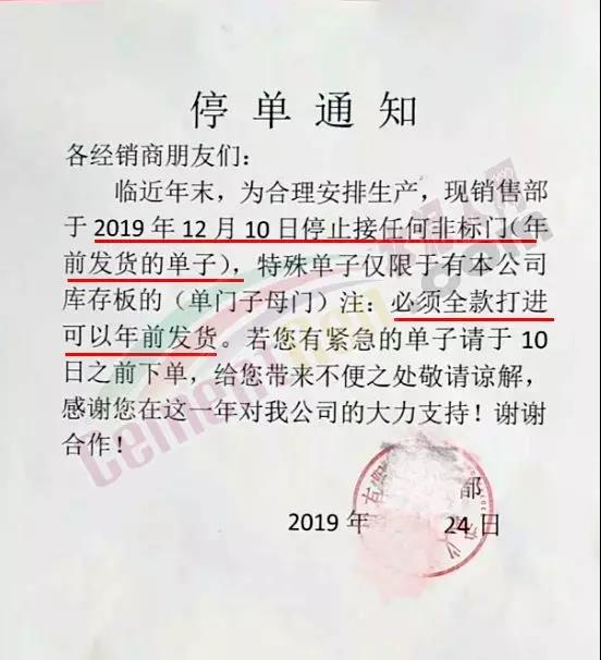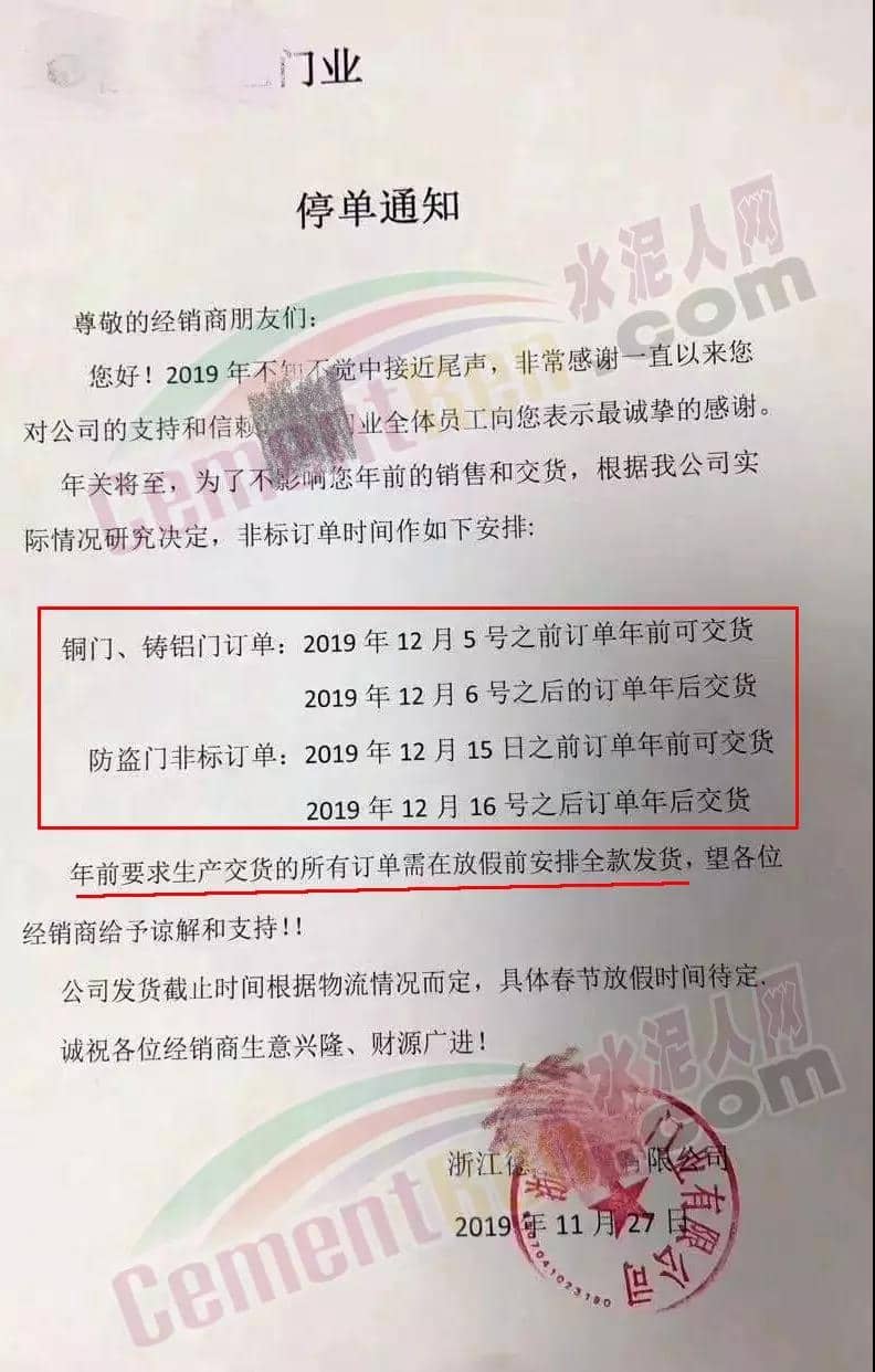 某企業(yè)停單通知接單截止日期為12月10日~28日,并表示停單后的訂單將在年后生產發(fā)貨。各企業(yè)停止接單通知多有明確年前要求生產交貨的所有訂單需在放假前安排全款發(fā)貨。