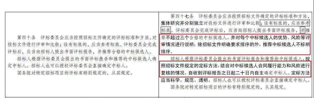 這意味著甲方有著更大的自主選擇權(quán),而評標(biāo)委員會(huì)只推薦三個(gè)中標(biāo)候選人,而且不用排序。也就是說,不會(huì)有第一中標(biāo)候選人、第二中標(biāo)候選人、第三中標(biāo)候選之說。這也打破了評標(biāo)委員會(huì)推薦的第一中標(biāo)候選人默認(rèn)為中標(biāo)人的長期慣例。甲方只需要在三個(gè)中標(biāo)候選人當(dāng)中,自主確定中標(biāo)人。