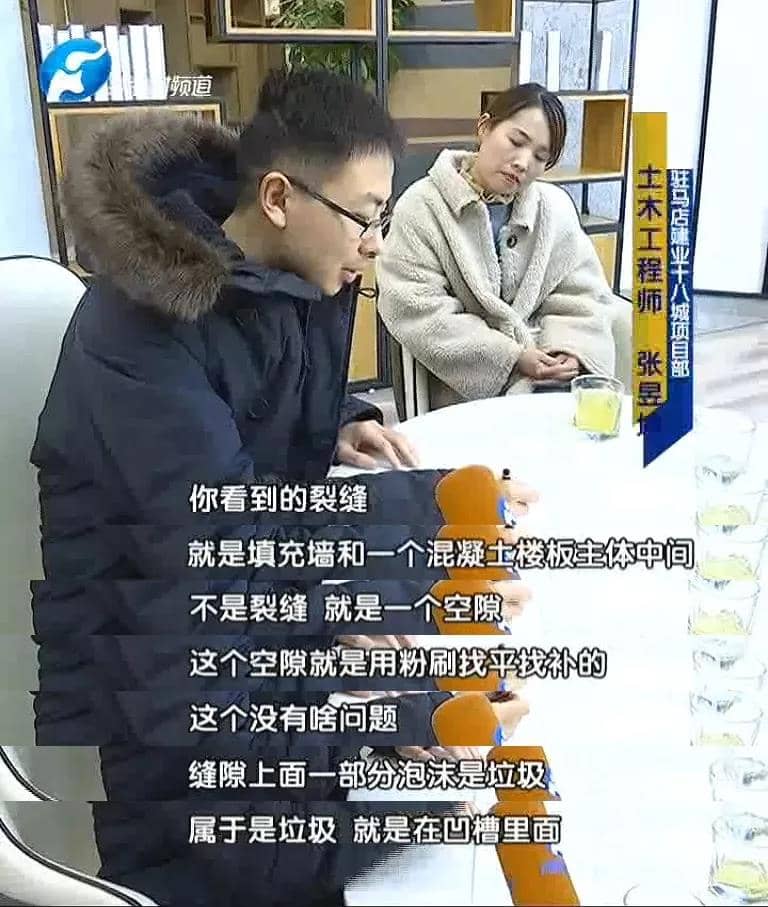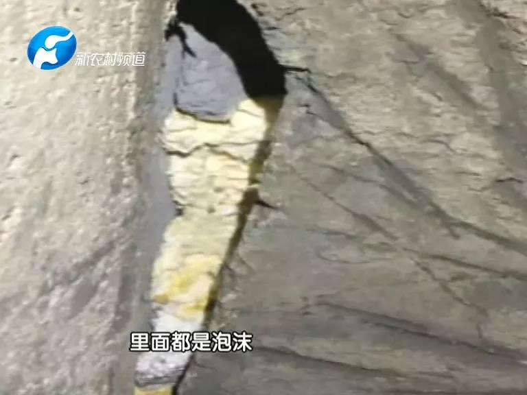 原來楊先生在交房之后發(fā)現(xiàn)房子里面有空鼓的現(xiàn)象,便讓維修人員把空鼓的地方敲了之后發(fā)現(xiàn)飄窗板上面墻邊的地方有裂縫,縫隙里面都是泡沫。