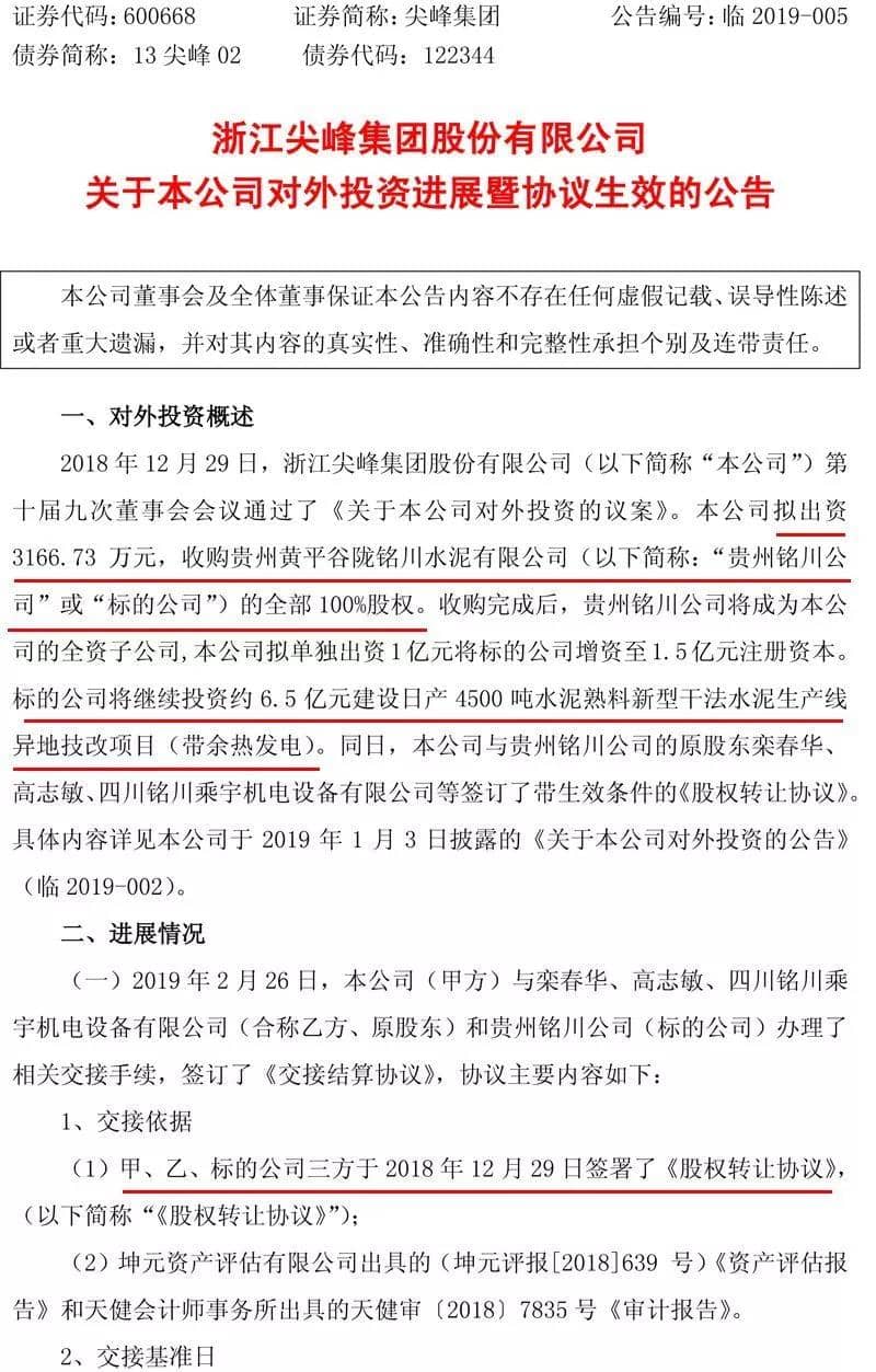 據(jù)了解,這條生產(chǎn)線是浙江尖峰集團股份有限公司出資3166.73萬元收購的貴州黃平谷隴銘川水泥有限公司(貴州銘川公司)。收購完成后,貴州銘川公司成為尖峰的全資子公司,并由尖峰擬單獨出資1億元將其注冊資本增資至1.5億元,又投資約6.5億元建設日產(chǎn)4500噸水泥熟料新型干法水泥生產(chǎn)線異地技改項目(帶余熱發(fā)電)。今年2月28日,浙江尖峰集團股份有限公司《關(guān)于本公司對外投資進展暨協(xié)議生效的公告》中披露了該收購的進展情況。截止公告日,原股東所持標的公司股份已全部過戶至本公司名下并完成了工商變更登記手續(xù),尖峰集團已持有貴州銘川公司100%股權(quán)。