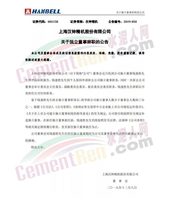 其中,漢鐘精機指出,錢逢勝因個人原因申請辭去公司獨立董事職務(wù),同時一并辭去公司董事會審計委員會主任委員、戰(zhàn)略委員會委員、提名委員會委員職務(wù)。