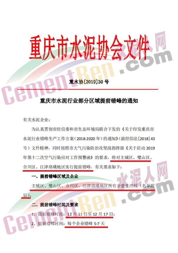 日前,重慶市水泥協(xié)會(huì)發(fā)布《重慶水泥行業(yè) 部分區(qū)域提前錯(cuò)峰的通知》(重水協(xié)【2019】30號(hào)文件)稱:為認(rèn)真貫徹市經(jīng)信委和市生態(tài)環(huán)境局聯(lián)合下發(fā)的《關(guān)于印發(fā)重慶市水泥行業(yè)錯(cuò)峰生產(chǎn)工作方案(2018-2020 年)的通知》(渝經(jīng)信法[2018]43號(hào))文件精神,同時(shí)按照重慶市大氣污染防治攻堅(jiān)戰(zhàn)指揮部《關(guān)于啟動(dòng) 2019年第十二次空氣污染應(yīng)對(duì)工作預(yù)警函》的要求,將對(duì)主城區(qū)、璧山區(qū)、合川區(qū)、江津珞璜地區(qū)實(shí)行提前錯(cuò)峰。提前錯(cuò)峰區(qū)域及企業(yè):主城區(qū)、璧山區(qū)、合川區(qū)、江津珞璜地區(qū)所有全能生產(chǎn)線。
